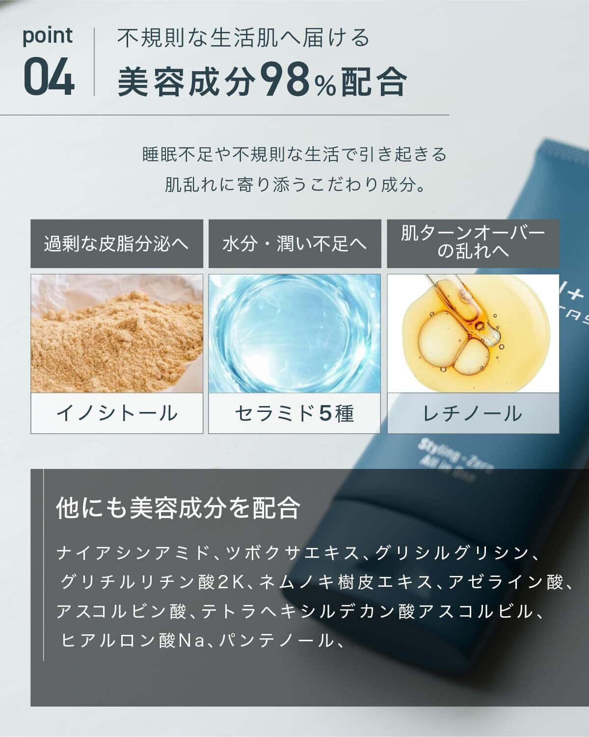 【98%美容液成分】寝不足・不規則な生活による「過剰皮脂(1)」「乾燥(2)」「ターンオーバー乱れ(3)」の肌不調へアクティブ美容成分を高配合。 (1)イノシトール / (2)セラミド5種 / (3)レチノール