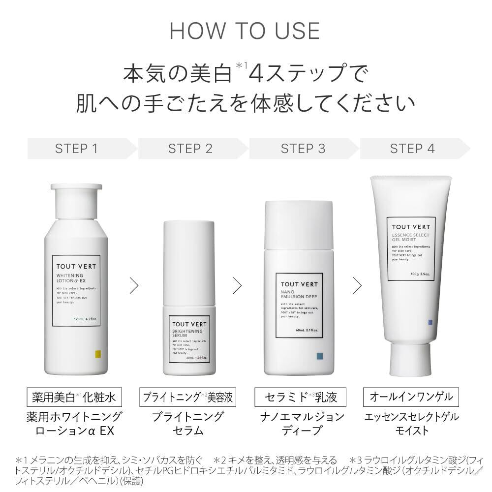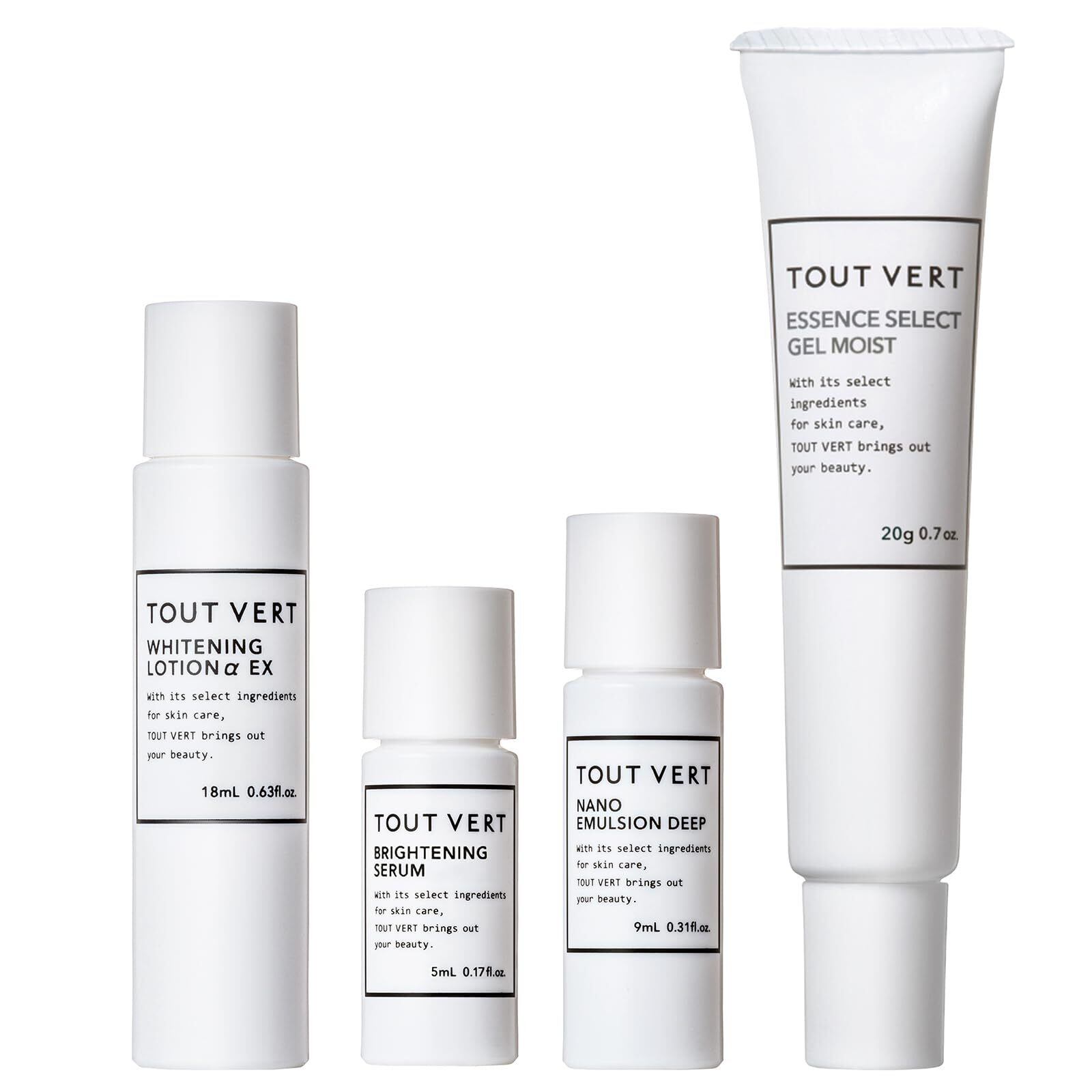 トゥヴェールのスキンケアを約10日間お試しいただける4点セットです。【セット内容】薬用ホワイトニングローションαEX 18mL(化粧水)、ブライトニングセラム 5mL(美容液)、ナノエマルジョン ディープ 9mL(乳液)、エッセンスセレクトゲル モイスト 20g(オールインワンジェル)