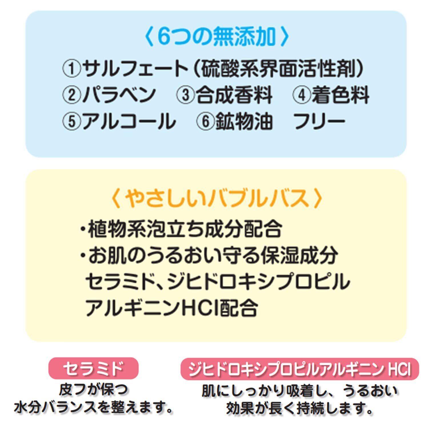 【楽しい泡風呂に入りながら保湿も】保湿成分のセラミド、ジヒドロキシプロピルアルギニンHClがお肌にしっかり吸着し、潤い効果が持続します。