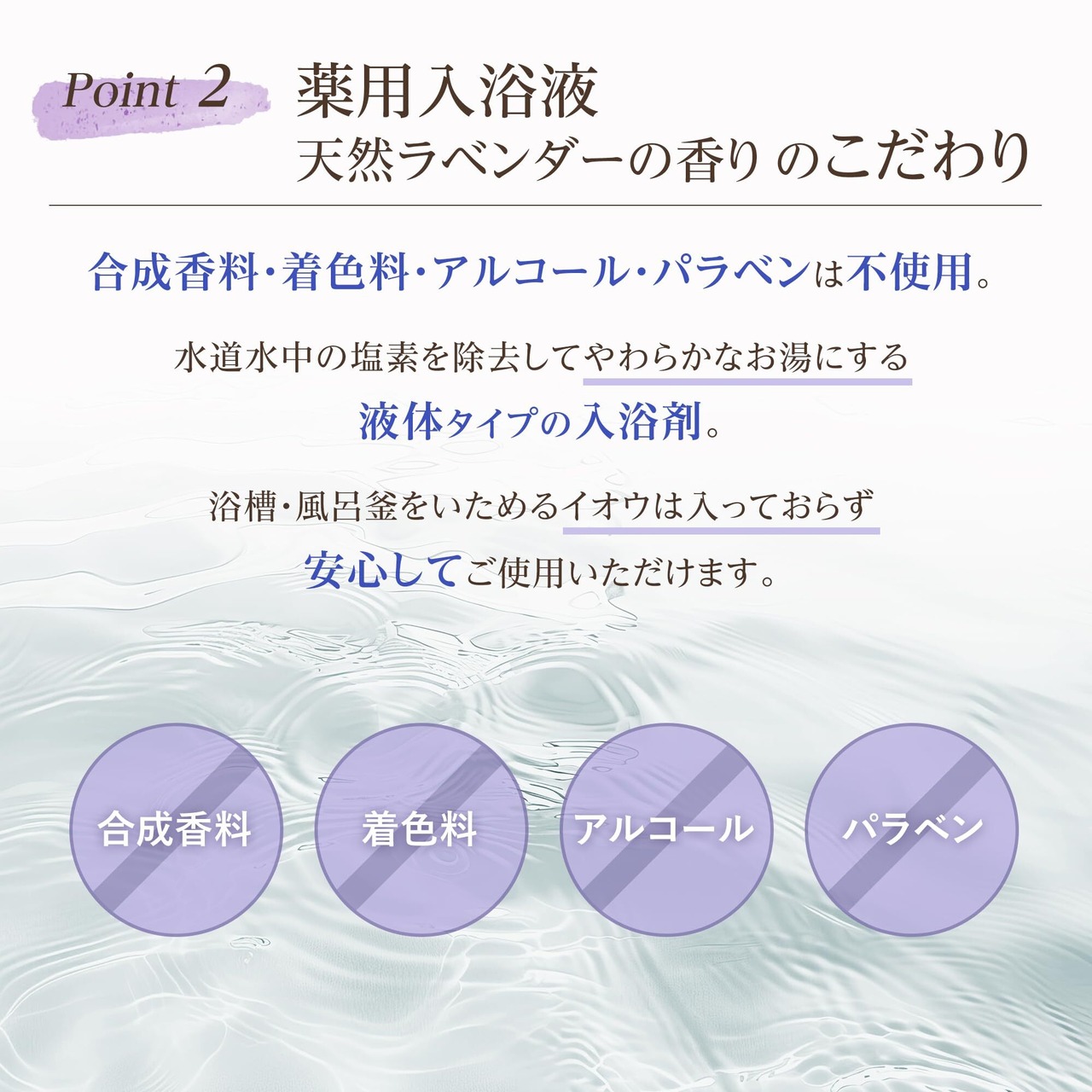 合成香料・アルコール無添加、天然ラベンダーの香りに癒されます。『薬用入浴液』は、水道水中の塩素を除去してやわらかなお湯にする液体タイプの入浴剤です。また合成香料・着色料・アルコール・パラベンは不使用。北海道上富良野産の天然ラベンダー香料をブレンドし、介護ケアする側も香りに癒され、やわらいだ気分になれます。