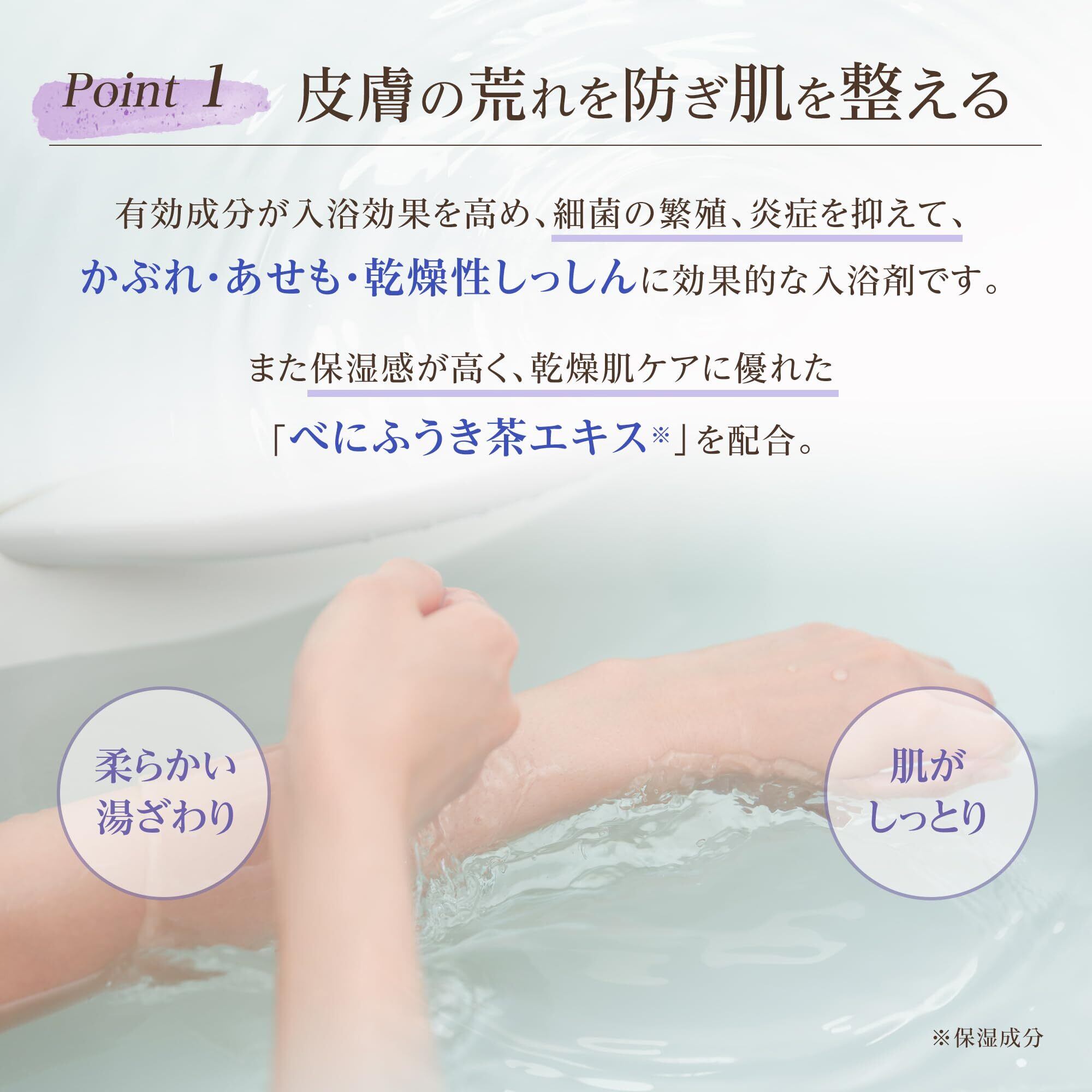 皮膚の荒れを防ぎ肌を整え、かぶれ・あせも・乾燥性しっしんを予防する入浴剤!『薬用入浴液』は、有効成分が入浴効果を高めてかぶれ・あせも・乾燥性しっしんの予防に効果的な入浴剤です。 また保湿感が高く、乾燥肌ケアに優れた「べにふうき茶エキス*」を配合。