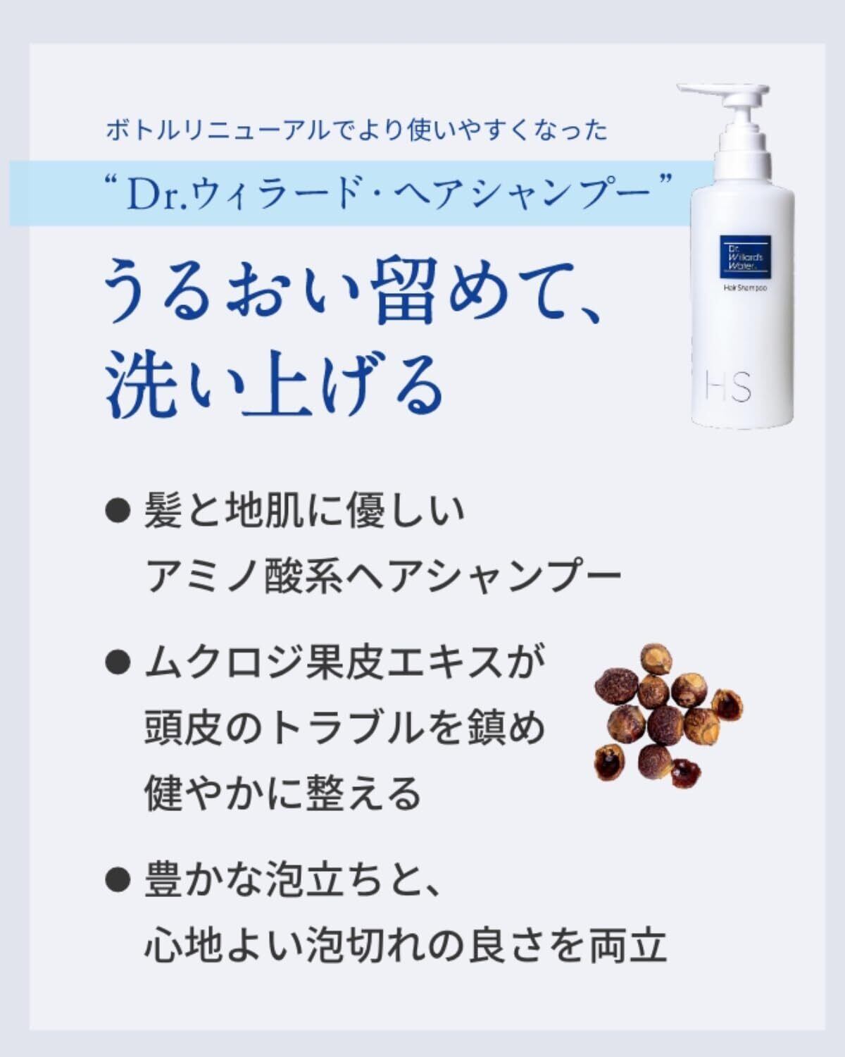 髪と地肌をやさしく洗い上げるマイルド処方。Dr.ウィラード・ウォーターをはじめ、ムクロジなどから抽出した植物性保湿成分で髪や地肌にうるおいを与えながら、やさしく洗い上げます。ハリとツヤのある髪へ導くアミノ酸系ヘアシャンプー。泡立ちがとても豊かで、泡ぎれも抜群。