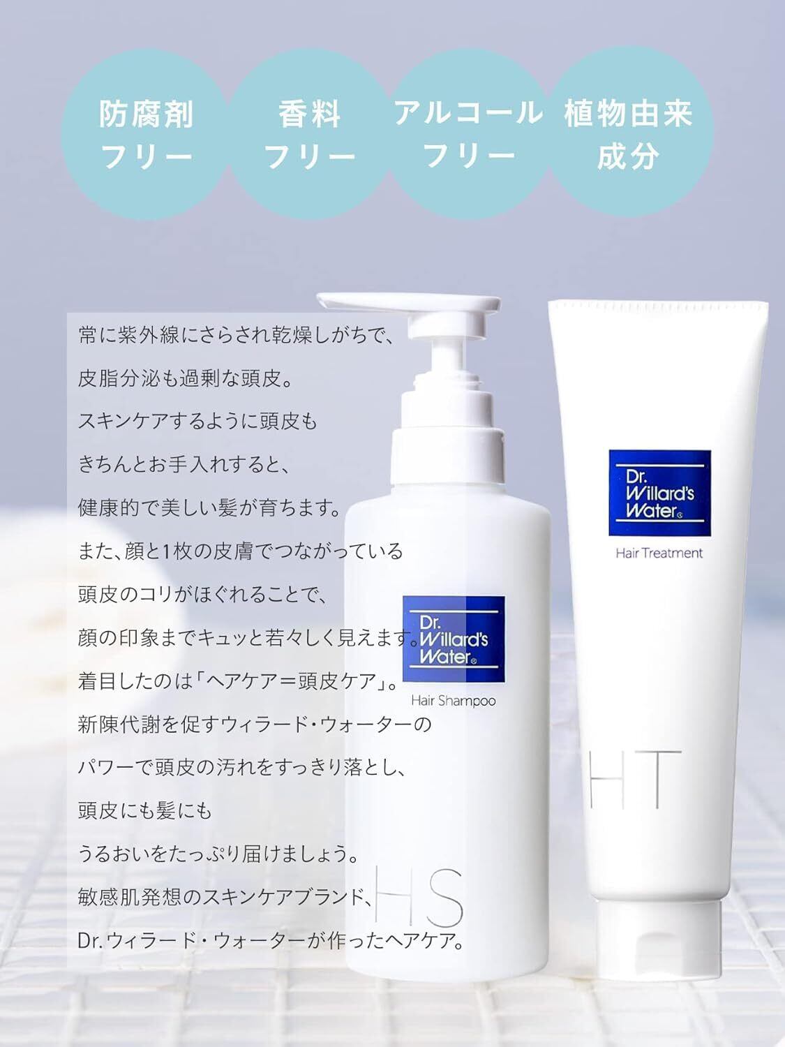 シャンプーによる髪への負担を極力おさえ、地肌に必要なうるおいを与えながら、毛穴の奥につまった皮脂や汚れをやさしく洗いあげるアミノ酸系ヘアシャンプーです。Dr.ウィラード・ウォーター25%配合