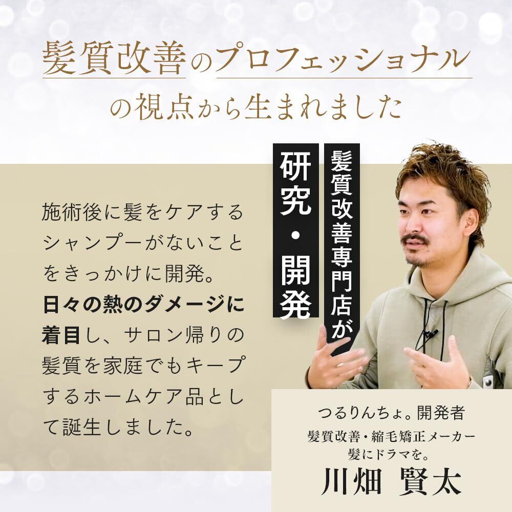 【サラッと軽くまとまりのある髪質へ】髪質に悩む全ての方に 365 日サロン帰りのクオリティをお届けします。 全国の縮毛、髪質改善専門店が使用する、髪を綺麗にすることに特化や、髪の補修力に優れた本気のシャンプー 「つるりんちょ。」縮毛、髪質改善などのアイロンを使用するメニューをした髪の毛専用に 開発されました。 髪の毛にかかるアイロンなどの「熱」ダメージに注目した新処方のシャンプー。 【 髪の毛の成分に最も近い洗浄成分】「ココイル加水分解ケラチン k」を使用することで髪 の毛を補修しながら洗浄することのできるシャンプーを実現。 また、内部補修のために低 分子から高分子のケラチンの中でも髪の毛と同じ構造を持つ成分を国内複数の美容メーカ ーの研究者と共に開発。 大手メーカーでは実現不可能なシャンプーを製作しました。 【こんなあなたへ】髪の毛に”熱"を与えるメニューに対し自宅でサロン品質のヘアケアを。高い補修力と独特の艶感が特徴で、使うほどサラサラの手触りを目指しました。ダメージ 毛やブリーチ毛、毎日アイロンを使用される方におすすめです。 【 縮毛・髪質改善専門店の「髪にドラマを。」】髪を綺麗にすることに特化し、髪の補修力に優れたヘアケアと、縮毛に特化した薬剤の製造・セミナ ー・教育を行う美容メーカーです。髪質に悩む全てのお客様に笑顔をお届けするために、美容師様が自信を持って技術提供できるよう、美容業界の理想の未来づくりをサポートします。