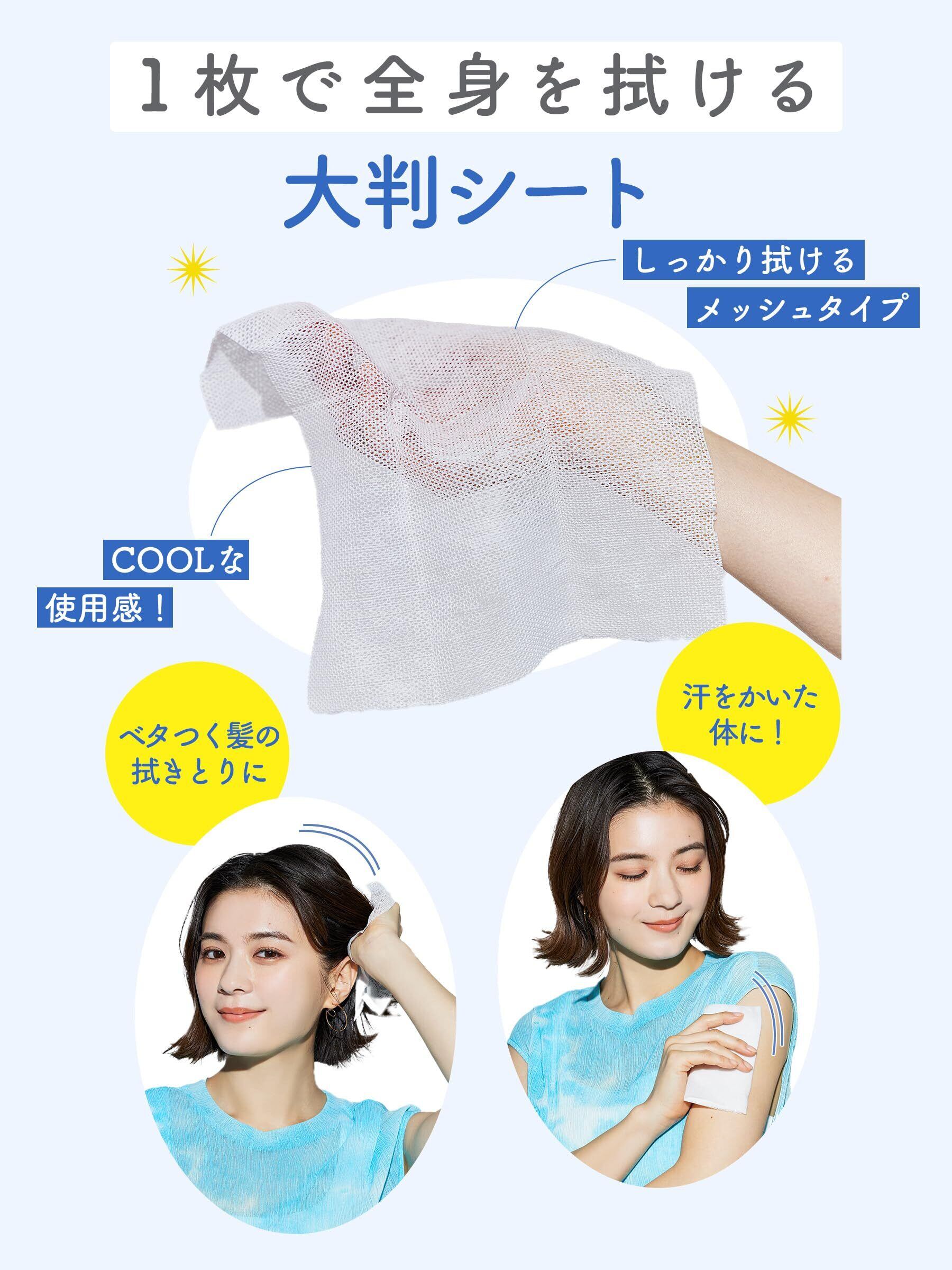 【ご使用上の注意】●お肌に異常が生じていないかよく注意して使用してください。●お肌に傷・はれもの・湿疹等、異常のある時は使用しないでください。●使用中または使用したお肌に、赤み・腫れ・かゆみ・刺激、色抜け(白斑等)や黒ずみ等の症状があらわれた場合、直射日光があたって同様の異常が出た時は使用を中止し、皮膚科専門医等にご相談ください。そのまま使用を続けますと症状が悪化することがあります。●目に入らないように注意してください。目に入った場合は、すぐに水かぬるま湯で洗い流してください。異常が残る場合は、眼科医にご相談されることをおすすめします。●粘膜、傷口、乳幼児、メントールの冷感刺激に弱い方、アルコール過敏症の方は使用しないでください。●ヘアマニキュア等が色落ちすることがあるので、あらかじめ目立たない部分でご確認の上、ご使用ください。●衛生上、一度使用したシートは、再度使用しないでください。また一度取り出したシートは、袋に戻さないでください。●開封後は早めに使用してください。●当製品は水に溶けませんので、下水等に流さないでください。●洗面台や鏡台、家具等を拭いたり、衣服などにつかないようにしてください。●乳幼児の手の届かないところに保管してください。●極端に高温又は低温の場所、直射日光のあたる場所には保管しないでください。●乾燥による品質の劣化を防ぐため、使用後はシールをきちんと閉めてください。