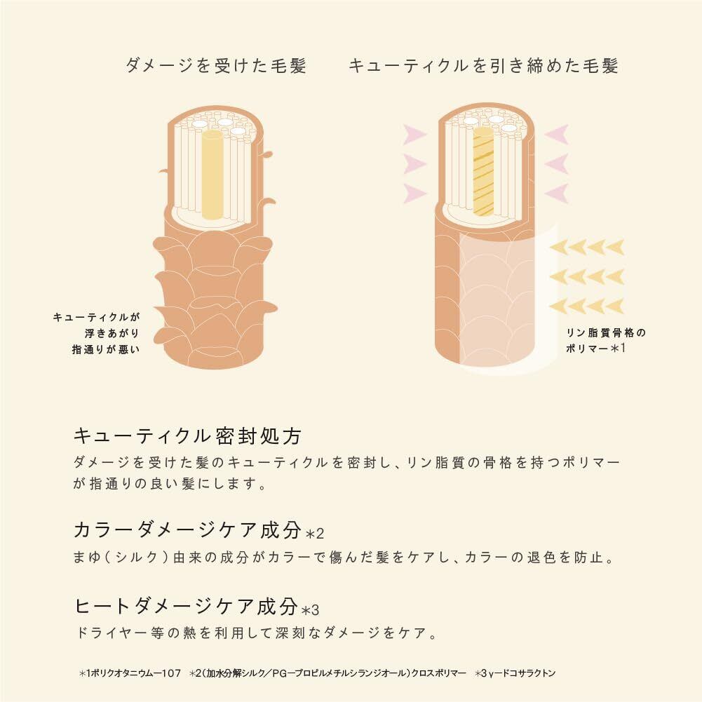 【つるつるとまとまるシルク艶髪へ】ヘアカラーやアイロンの摩擦・熱などで捲れたキューティクルを密封し、毛先までつるつるまとまるシルク艶髪へ導きます。カラーダメージケア成分が毛髪表面をコートし、カラー褪色を防止。