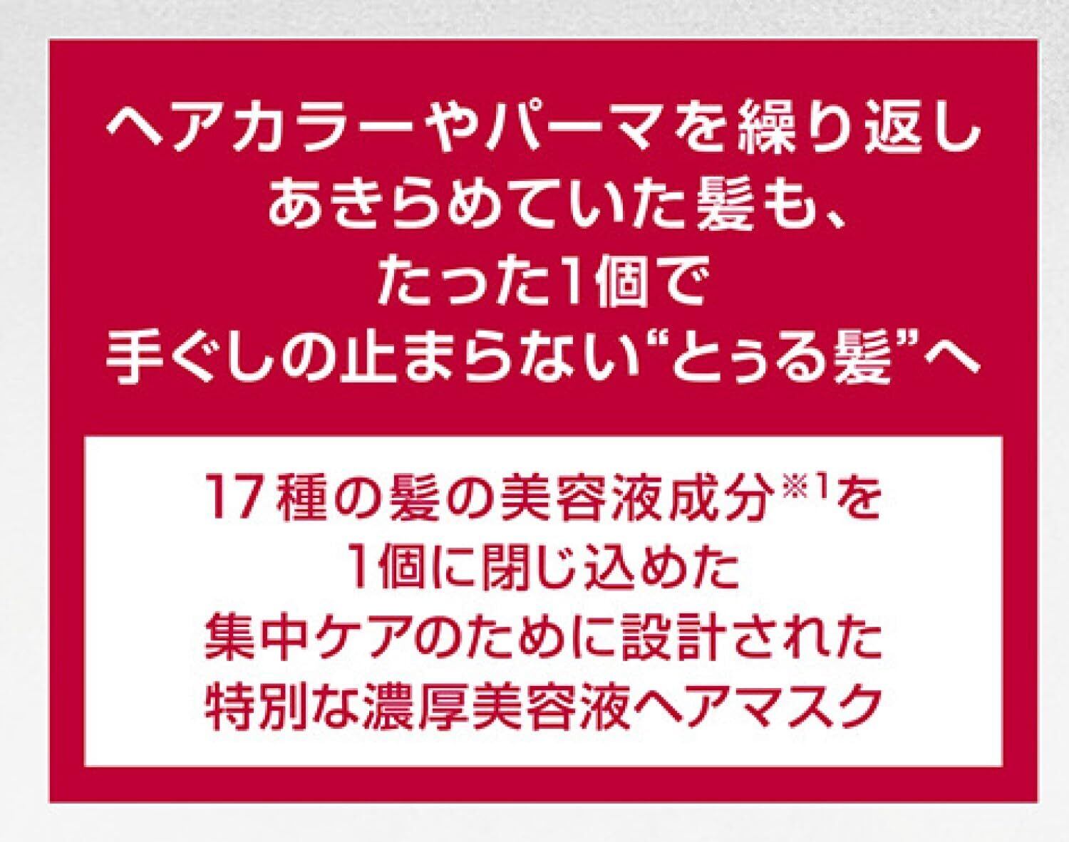 ヘアカラーやパーマを繰り返しあきらめていた髪も、たった1個で手ぐしの止まらない“とぅる髪”へ。髪の美容液成分配合。集中ケアのために設計された特別な濃厚美容液ヘアマスク。スペシャルケア用。個包装タイプ。数量限定品。上品で心地よい、透明感のあるグレースフローラルの香り