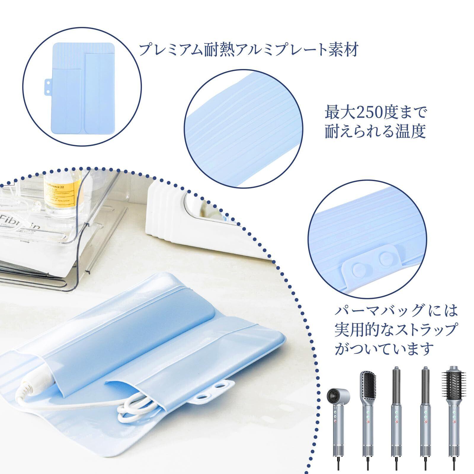【ヘアアイロンケース】このヘアアイロンケースはシンプルなスタイルで、さまざまな環境に適しており、全体的な美観を高めます。電源コードを便利に収納できる専用ポケット付きです。この設計により、保管がより整頓されるだけでなく、使用中に電源コードが高温によって損傷するのを防ぎ、電源コードの耐用年数を延ばします。同時に、ポケットの設定により、外出時の持ち運びにも便利になり、すべてのアクセサリをきちんとまとめることができます。