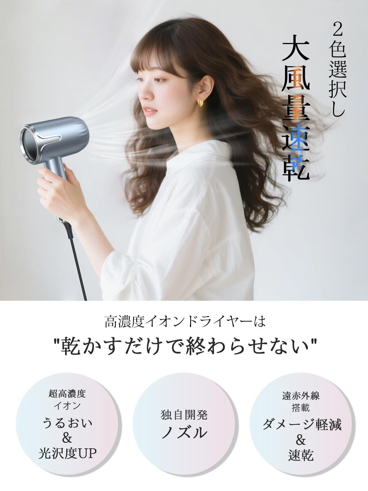 【速乾&大風量設計 】本製品は大風量ドライヤーとして、強力な気流を生み出し、髪を素早く乾かしながら熱ダメージを軽減します。特に朝の忙しい時間帯や頻繁に髪を洗う方におすすめ!従来のドライヤーと比較して速乾性能が50%向上し、ロングヘアの方でもすぐにサラサラの仕上がりを実感できます。