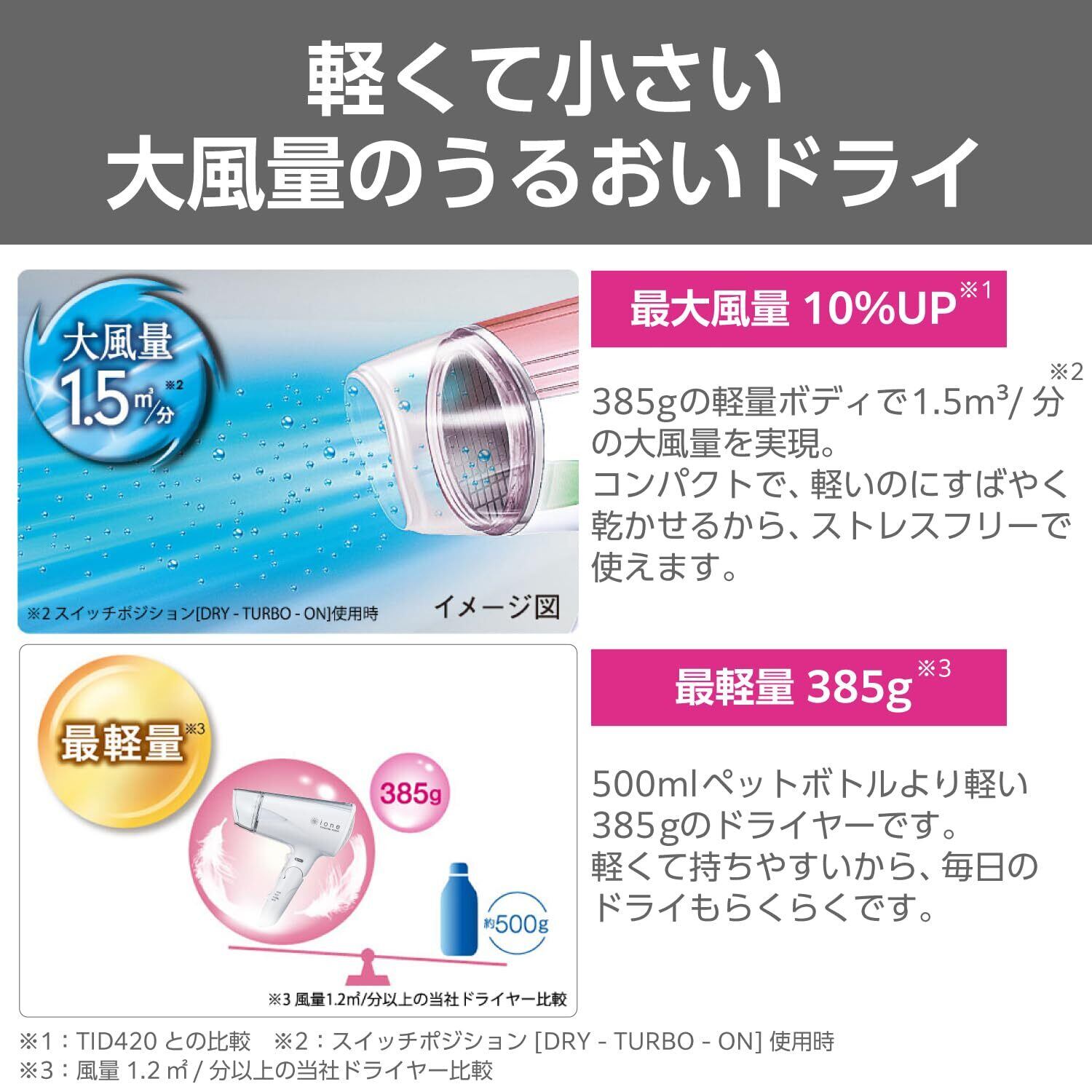 385gの軽量ボディで1.5m3/分※2の大風量を実現。コンパクトで、軽いのにすばやく乾かせるから、ストレスフリーで使えます。※1:TID420との比較※2 :スイッチポジション[DRY - TURBO - ON]使用時