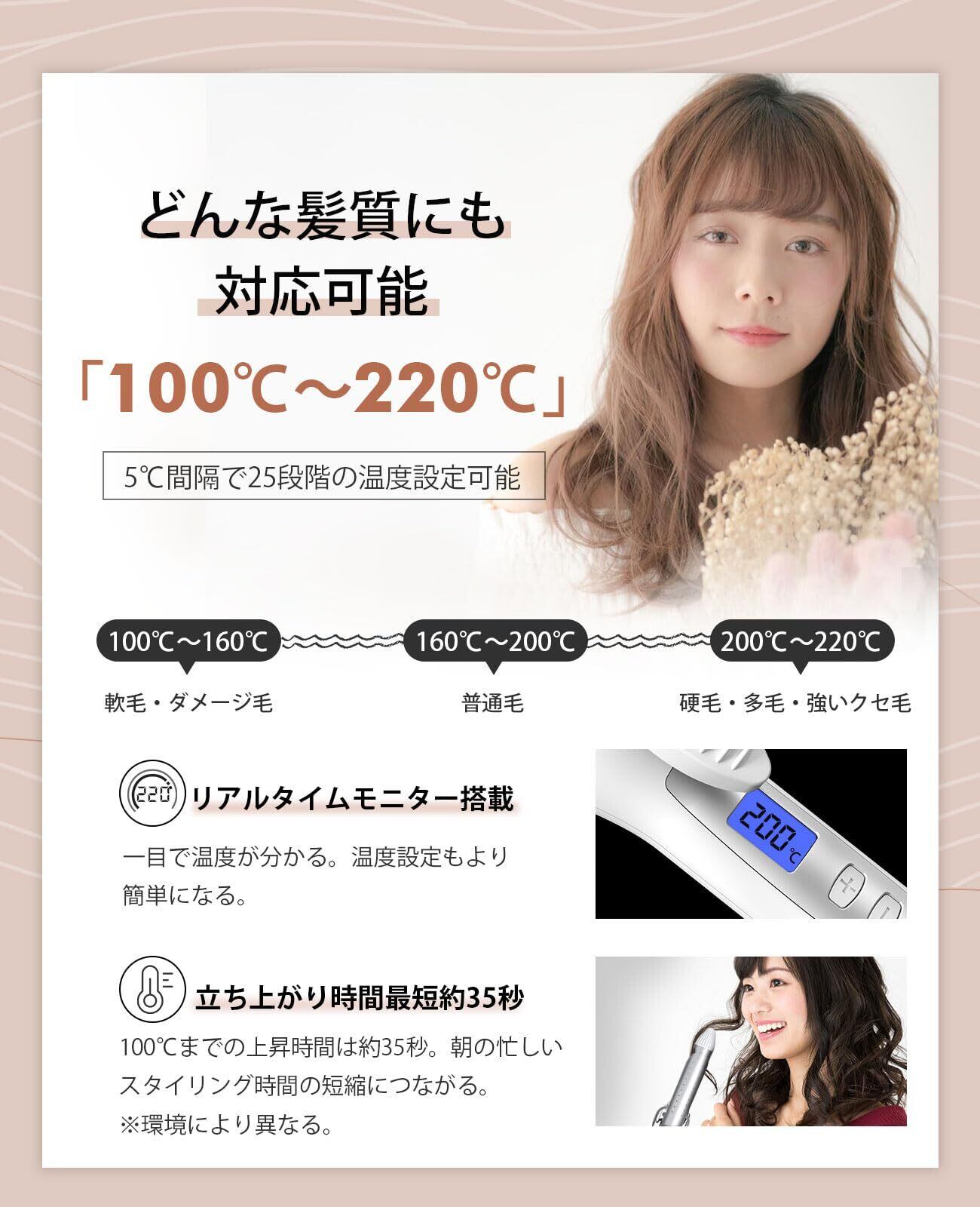 【100℃~220℃25段階の温度調節可能⇒髪質に最適な温度を見つける】当社のカールアイロンは最高温度220℃のプロ仕様で、100℃~220℃まで、5℃ごとに25段階で温度調整が可能です。髪質やヘアスタイルに応じて最適な温度を調節できます。また、耐熱性が強いスタンドを搭載しており、熱が冷めるのを待つことなく置けるのが便利です。