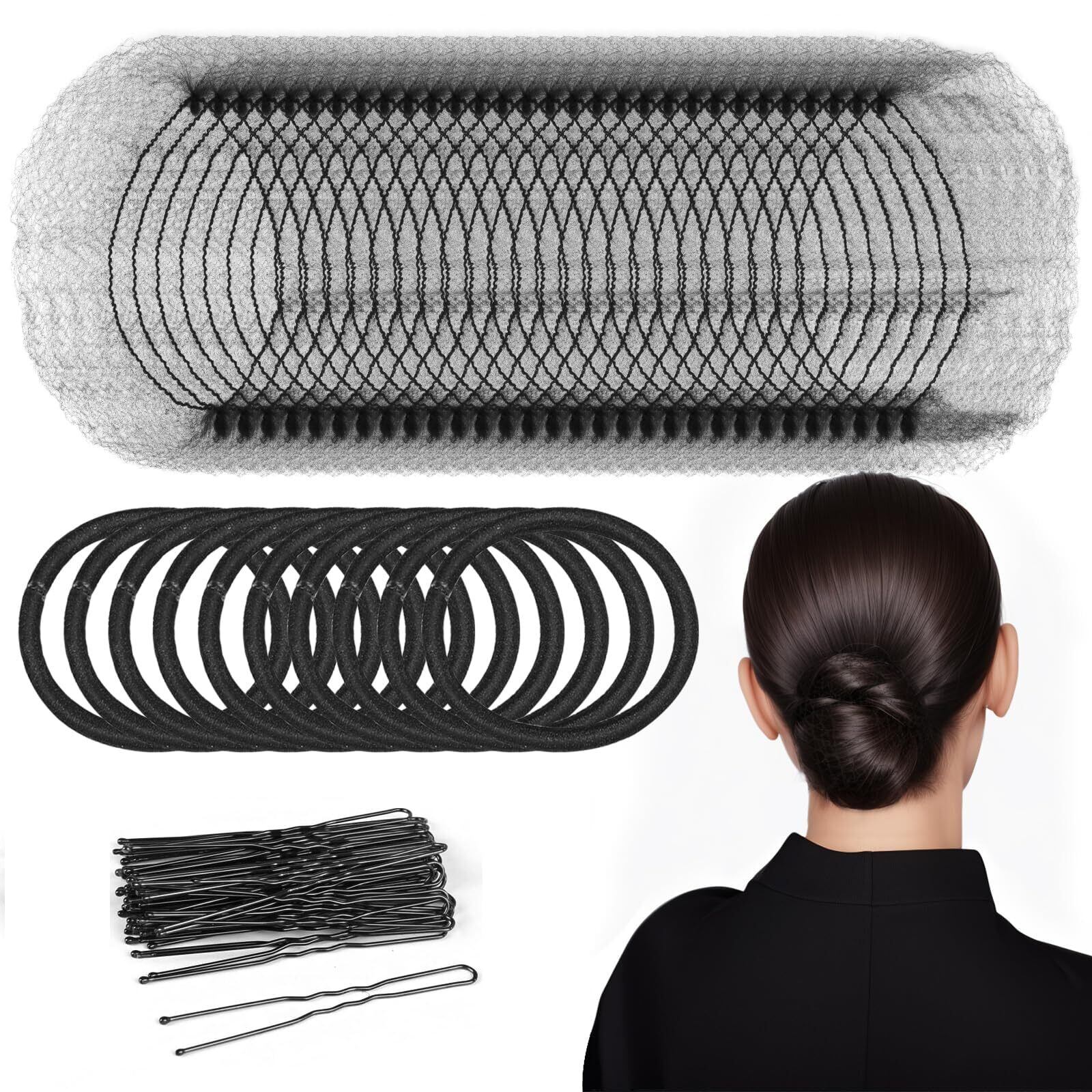 セット内容:高品質シニヨンネット20枚+専用黒7cmUピン40本20枚10枚+黒4mm強力ヘアゴムバンド10本を同梱。他店から追加購入不要で、時間と費用を節約。