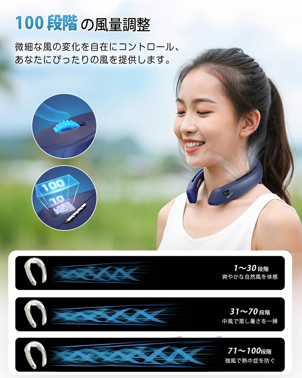 【超強力送風&100段階風量調節】このネックファンは、業界トップクラスの7500r/m高速回転モーターを採用。従来の首掛け扇風機 ネッククーラーと比べて集風効率99%向上を実現し、強力な風を長時間持続!さらに、右側のダイヤルを回すだけで1~100段階まで細かく風量を調節可能。あらゆるシーンにピッタリ合わせられます。夏の熱中症対策やアウトドア、通勤・通学にも最適な一台です!