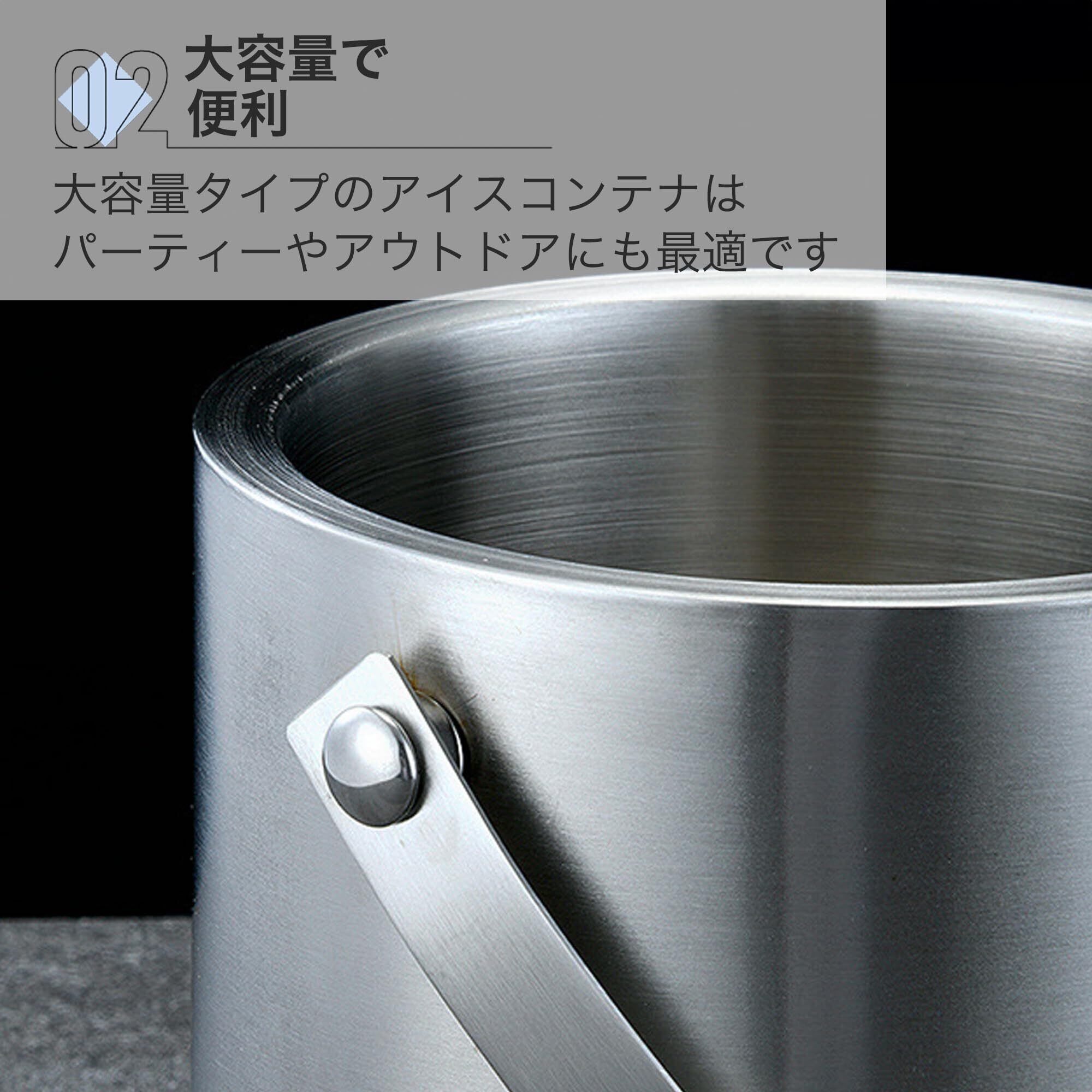 【溶けにくい二重構造】 アイスペールは、中空二重層設計により氷が溶けにくく、冷たさを長時間保持できます。 トング、ハンドルとフタが付いており、持ち運びや使用後の保管も便利です。