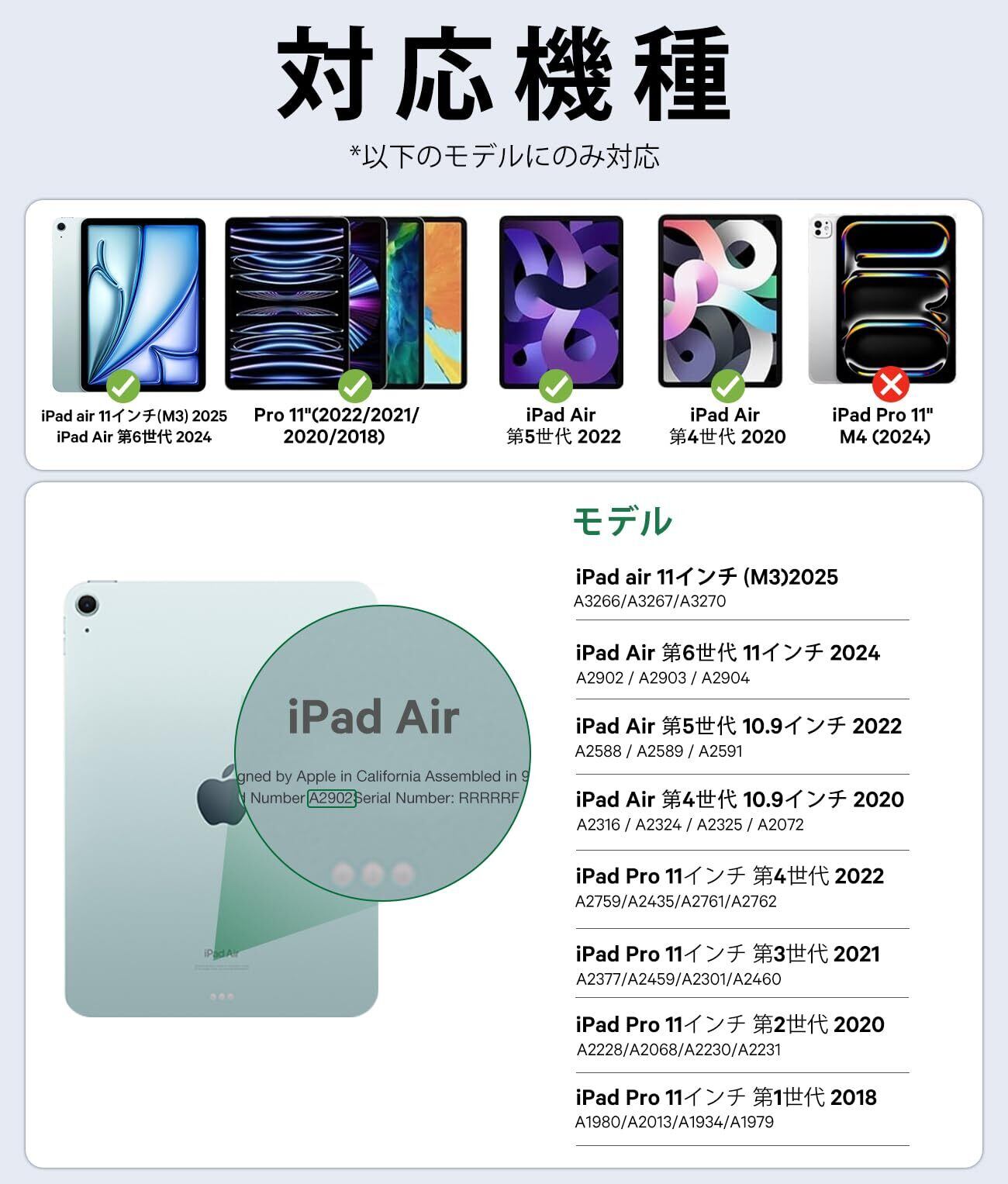【対応機種】このキーボードケースはipad Air 11(M3)2025年(モデル:A3266/A3267/A3270)、ipad Air 第6世代2024春発売(モデル:A2902 / A2903 / A2904)、ipad air第五世代2022春発売(モデル:A2588/A2589/A2591)、ipad air第四世代2020秋発売(モデル:A2072/A2316/A2324/A2325)、ipad Pro第4世代(2022年モデル:A2759 / A2435 / A2761 / A2762)、ipad Pro第3世代(2021年モデル:A2301/A2459/A2460)、iPad Pro 11インチ第2世代2020春発売(モデル:A2228 / A2068 / A2230 / A2231)、第一世代2018秋発売(モデル:A1980 / A2013 / A1934)に対応できます。オシャレと便利、日常使用と旅行に完璧です。ご注文前にモデルを確認ください。ご注意:本製品はiPadとApple pencilを含めません。