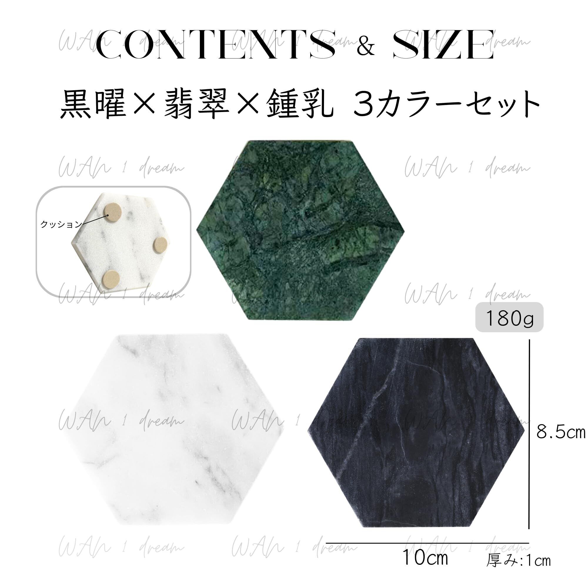 セット内容:大理石製 六角形プレート ×3枚(ブラック/ホワイト/エメラルドグリーン)