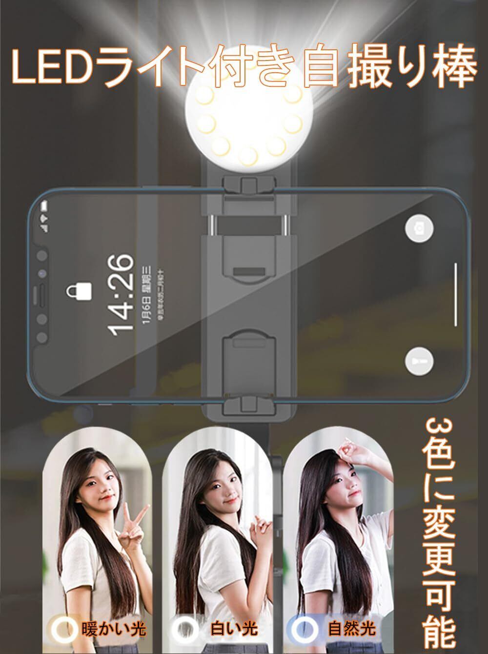 【LEDライト付き自撮り棒】シーンに応じて3色に調整できる充電式LEDライトを搭載、充電ケーブルが付属しており。付属のフィルインライトを使えば、夜間や薄暗い環境でも美しい美肌効果を演出でき、より見栄えの良い自撮り写真やライブ配信、動画を撮影できます。