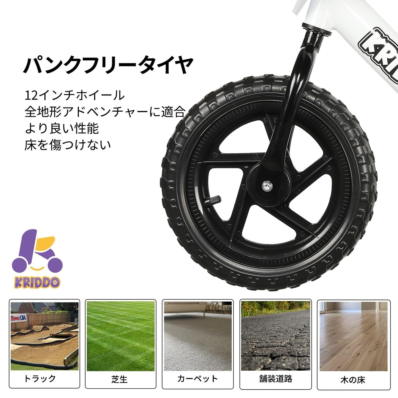 【超厚手オールテレインタイヤ】このバランスバイクは、パンク防止タイヤを前後に搭載しており、草地や歩道でも安定して走行できるようになっています。お子様が様々な地面でも安定走行を実現できるように設計されています。