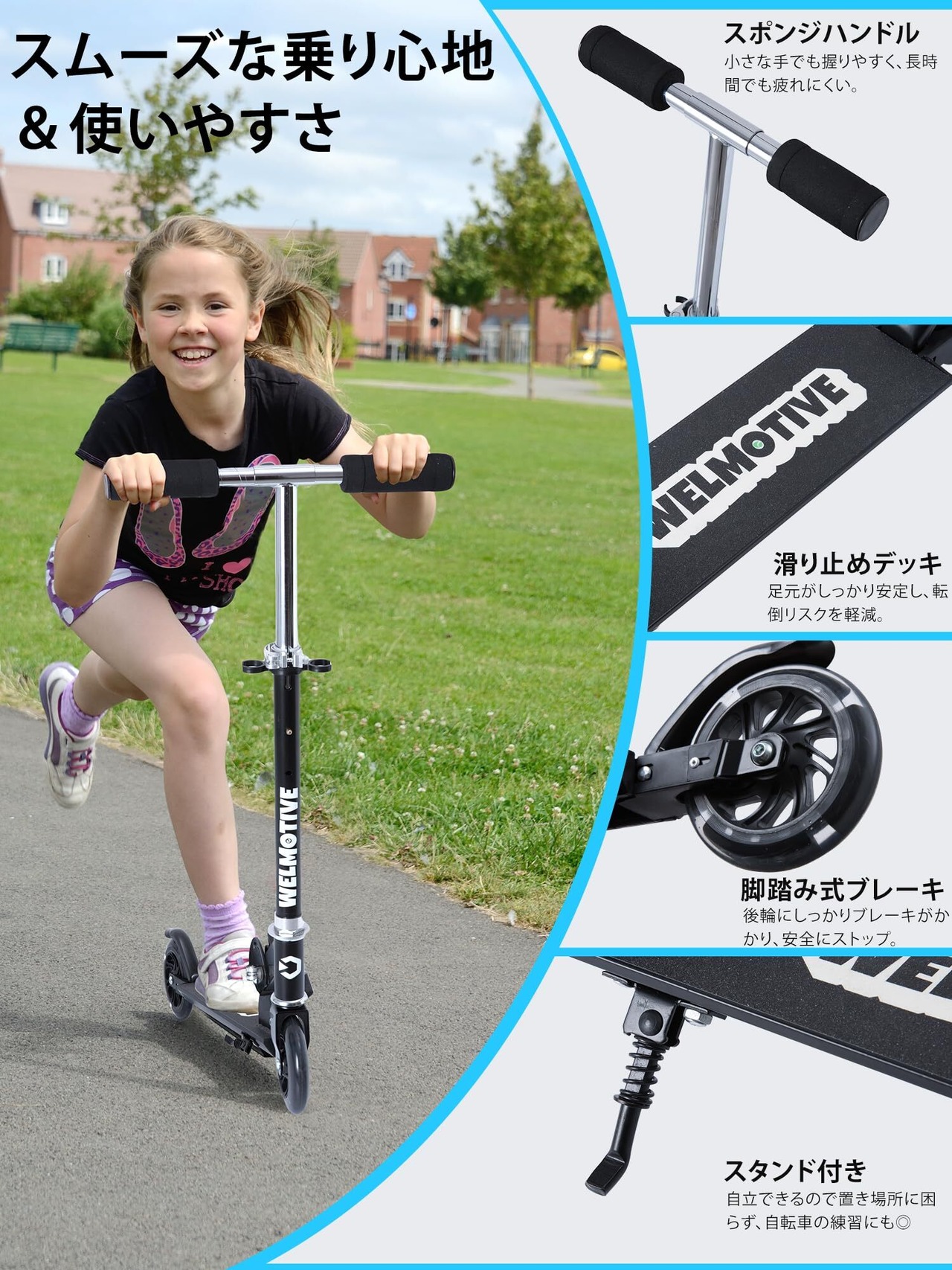 【遊びと成長が楽しめるキックスクーター!Welmotiveのキックボード!】このキックボードは、折りたたみ可能でスタンド付きの設計で、組み立てが不要なため、すぐにお子様の冒険に出発できます。成長に応じて三段階の高さ調整が可能で、長くお使いいただけます。