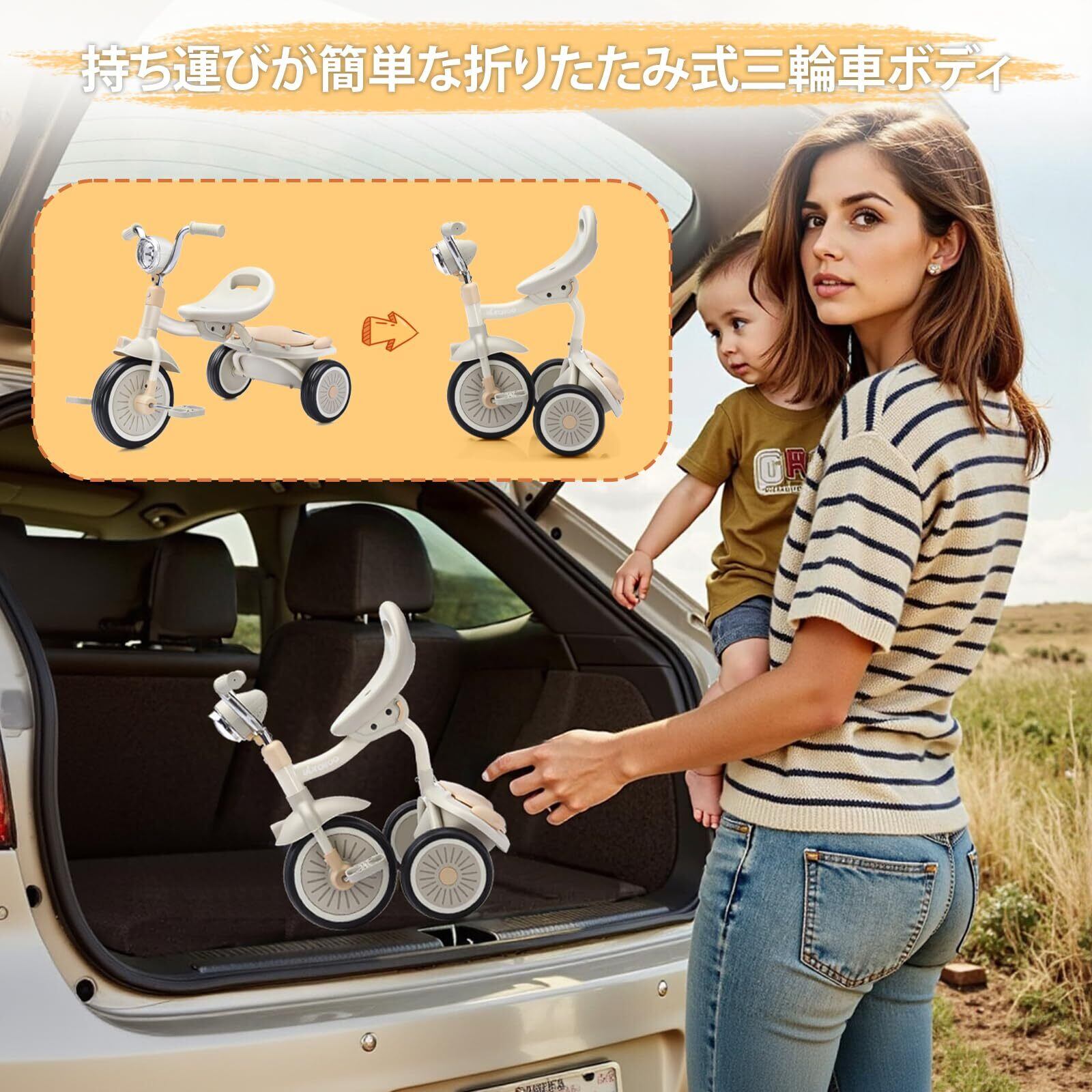 【耐用性&便利性】三輪車の後ろに収納枠があります。必要な物を収納することができます。折り畳んで簡単に運べます。車体には強度高い高炭素鋼を使用しており、安定した構造と強い耐荷重を実現しています。