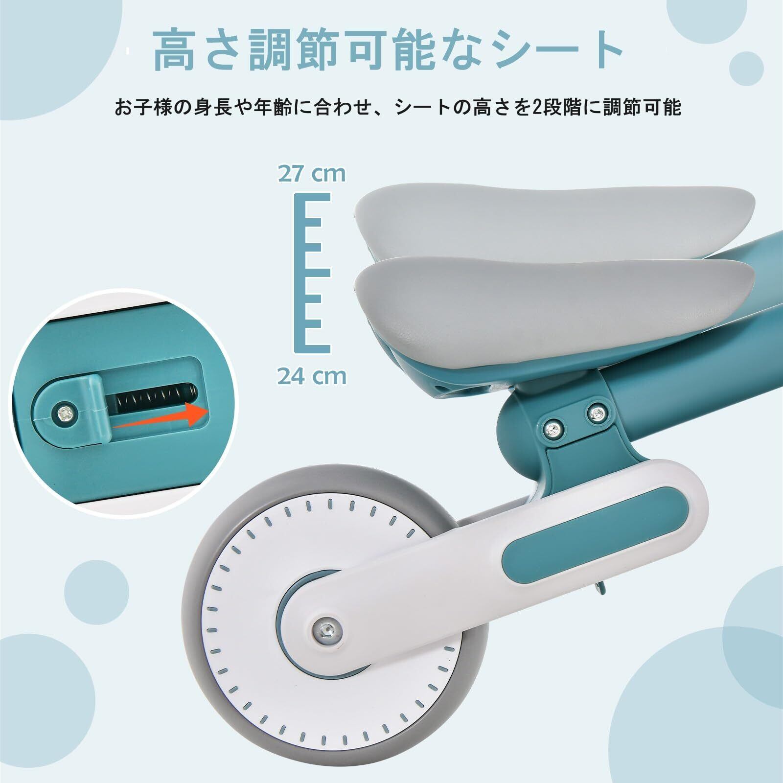 バイクのシートの高さは24cmと27cmの2段階で調節できるので、お子様の成長に合わせてシートの高さを調節することができます。