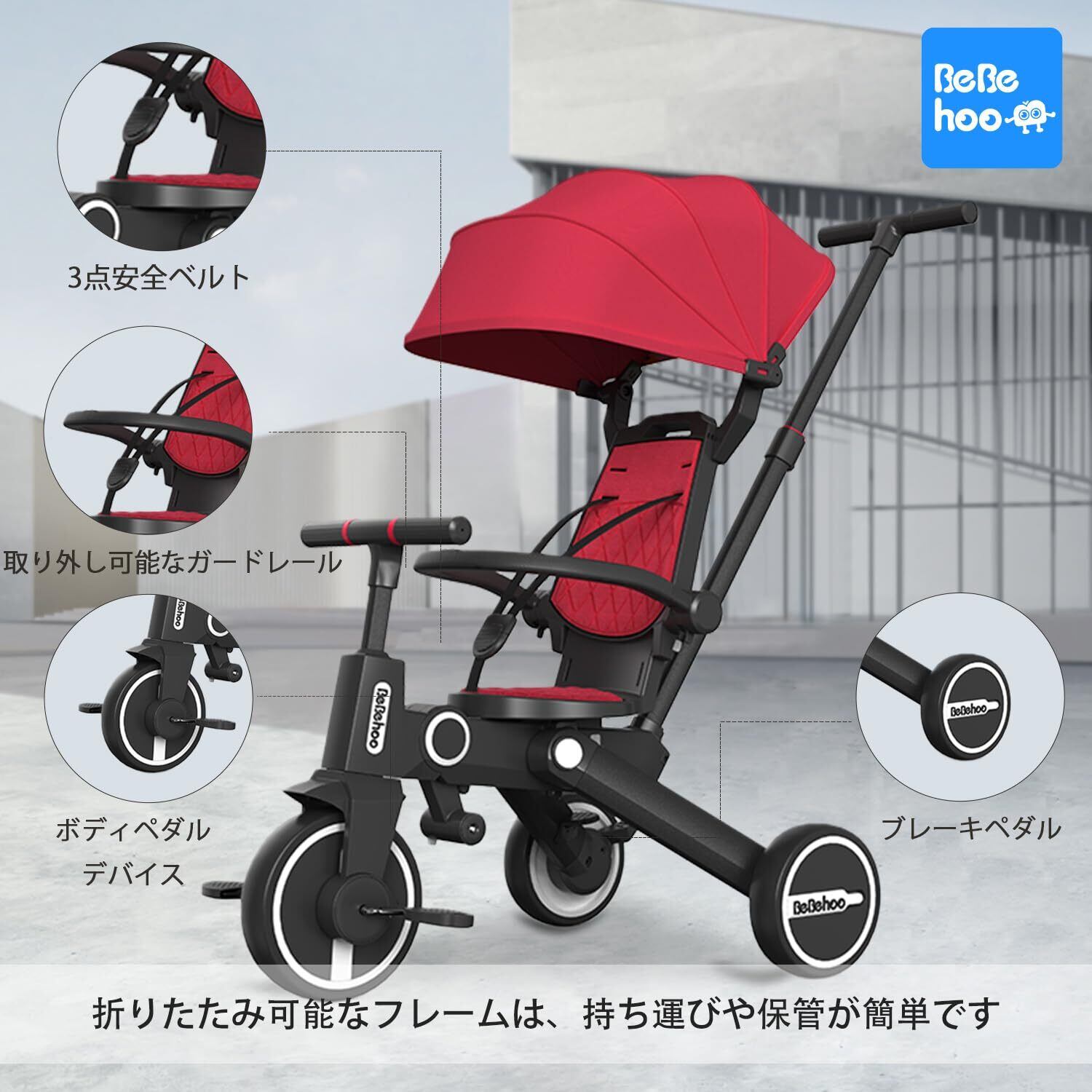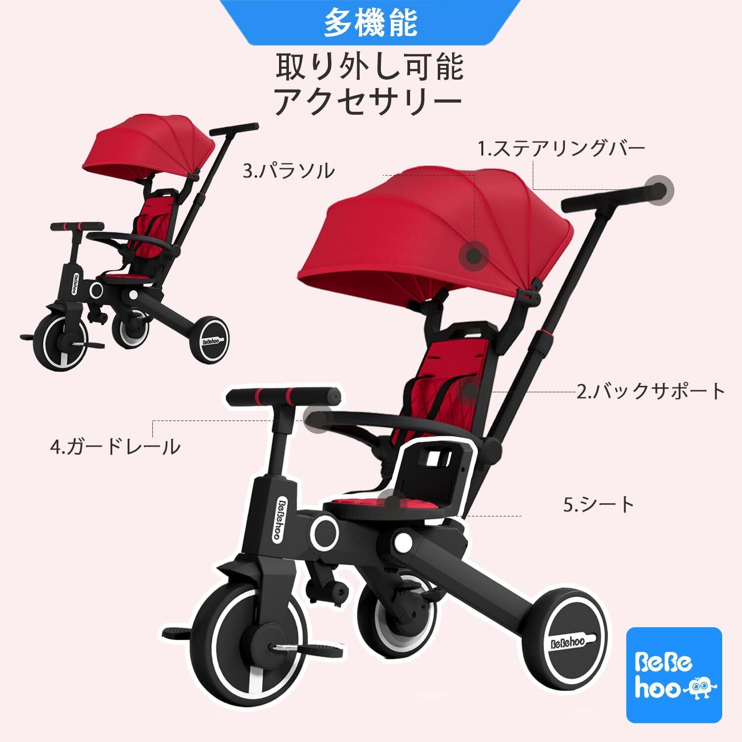 Bebehoo三輪ベビーカー 軽量三輪車 折りたたみ自転車 子供のバランスバイク 1-5歳の子供自転車 7-in-1が三輪車手押し棒付き (レッド)
