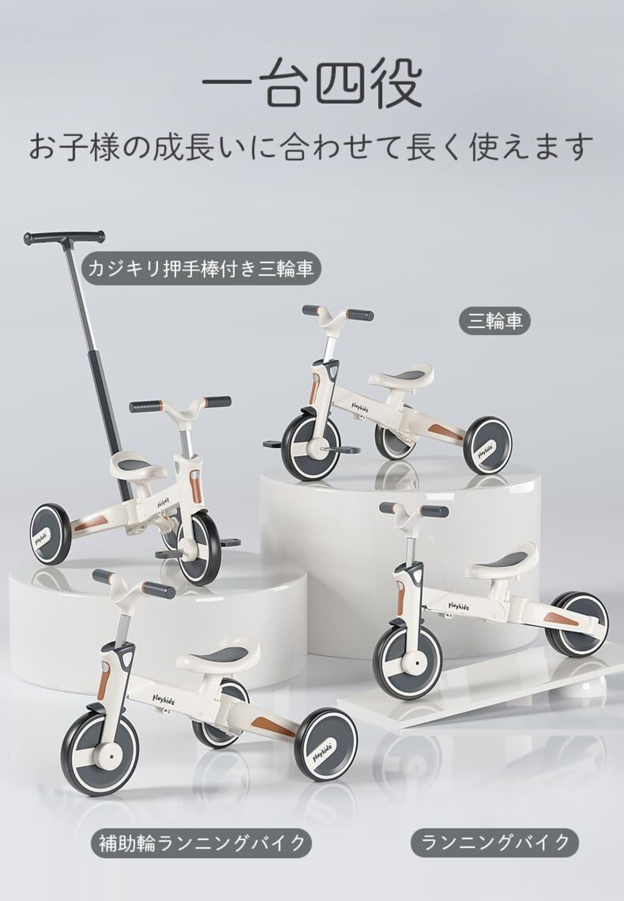 【一台四役】三輪車、カジキリ押し棒付き三輪車、ランニングバイク、補助輪ランニングバイク、4つの楽しみ方で、お子様の成長に合わせて変身できるので、長くご使用いただけます。PRO式は座席の調整が可能です。