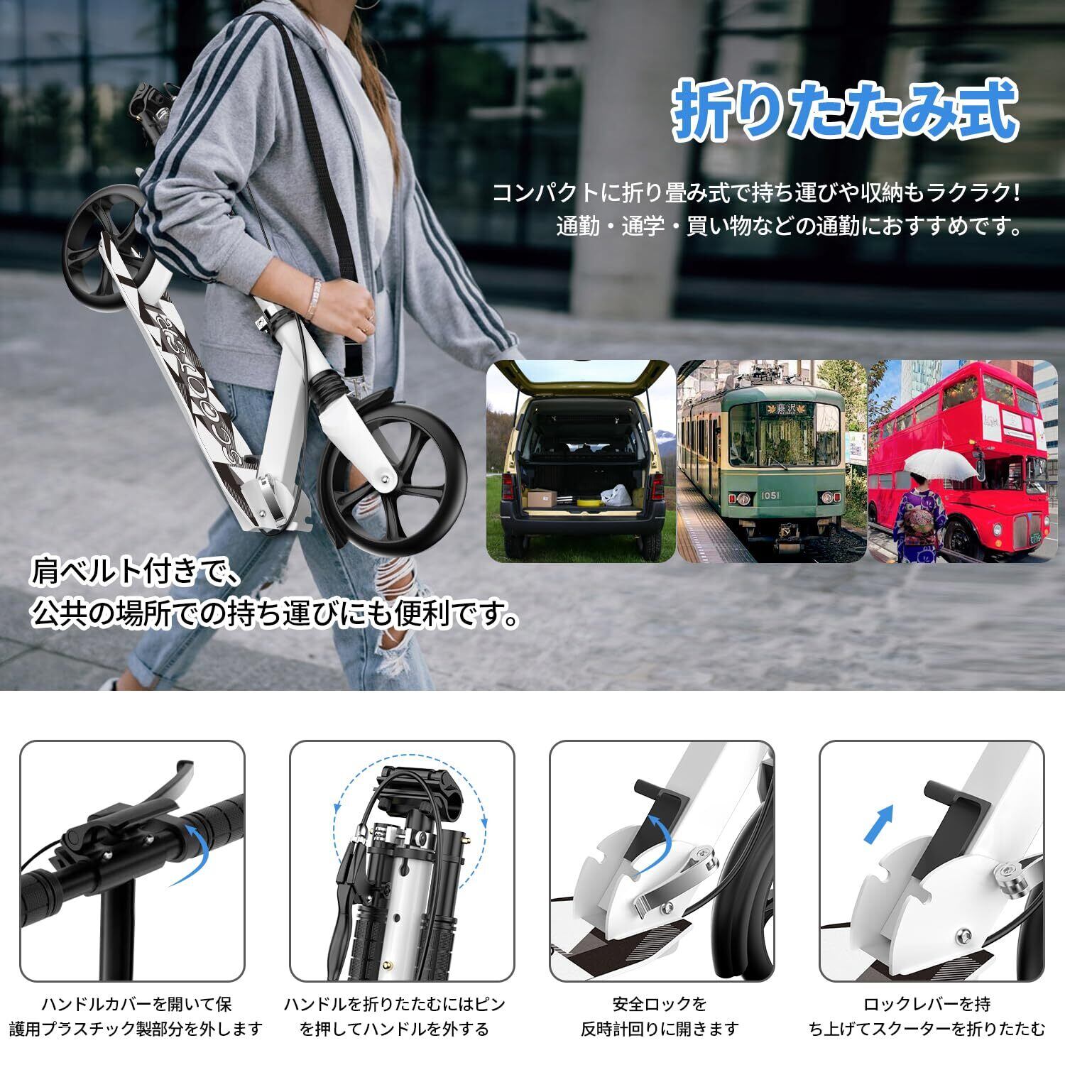 【折り畳み式&携帯収納】キックボード自体が折りたたむとコンパクトになり、入り口などの室内に保管したり、車のトランクに入れたりするのに便利で、スペースを取りません。風雨から離れた場所に保管することで、より長く使うことができます。携帯に便利で、電車やバスにも持ち運べますし、駐輪場の心配もないので、通勤・通学・買い物などの通勤におすすめです。また、自立可能な折りたたみ式スタンドを装備し、置き場に困りません。キックボードには肩ベルトが付属しており、折りたたんで公共の場で背負ったり手に持ったりすることができます。