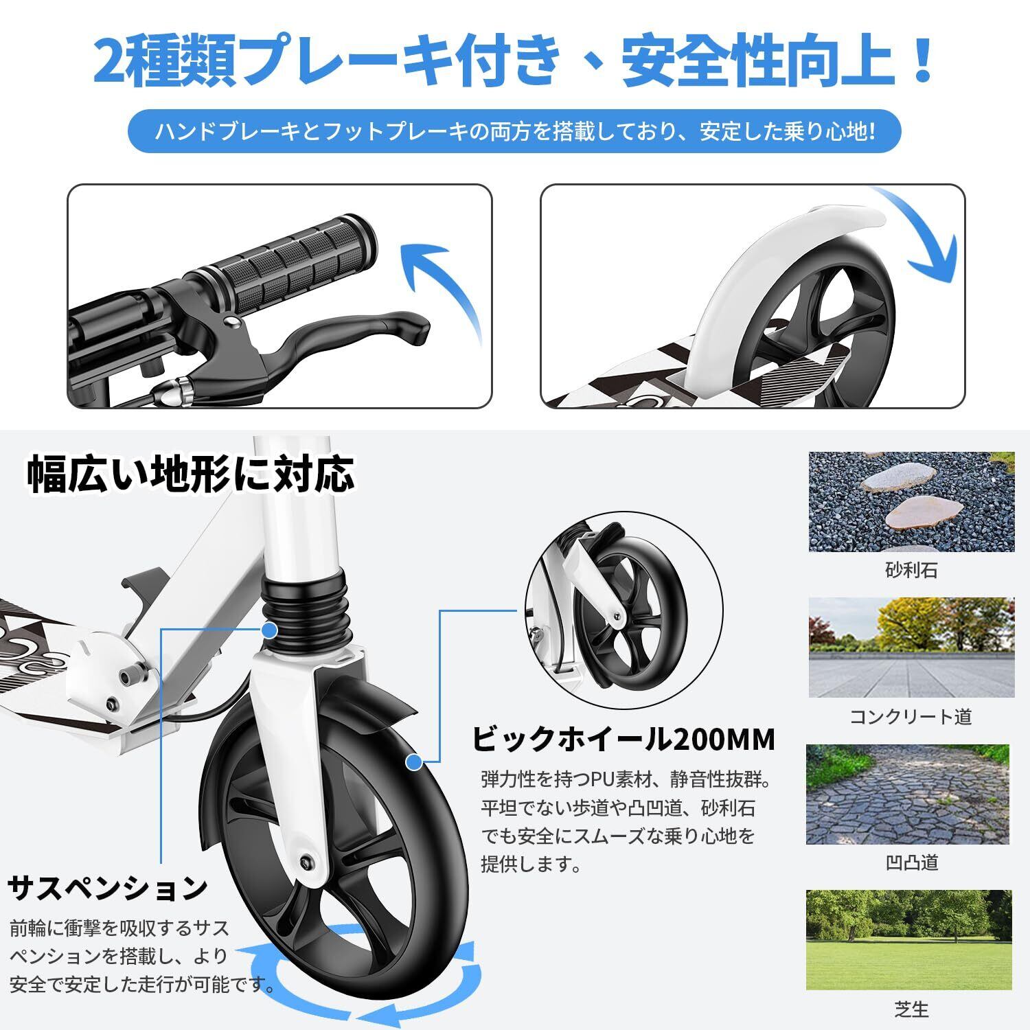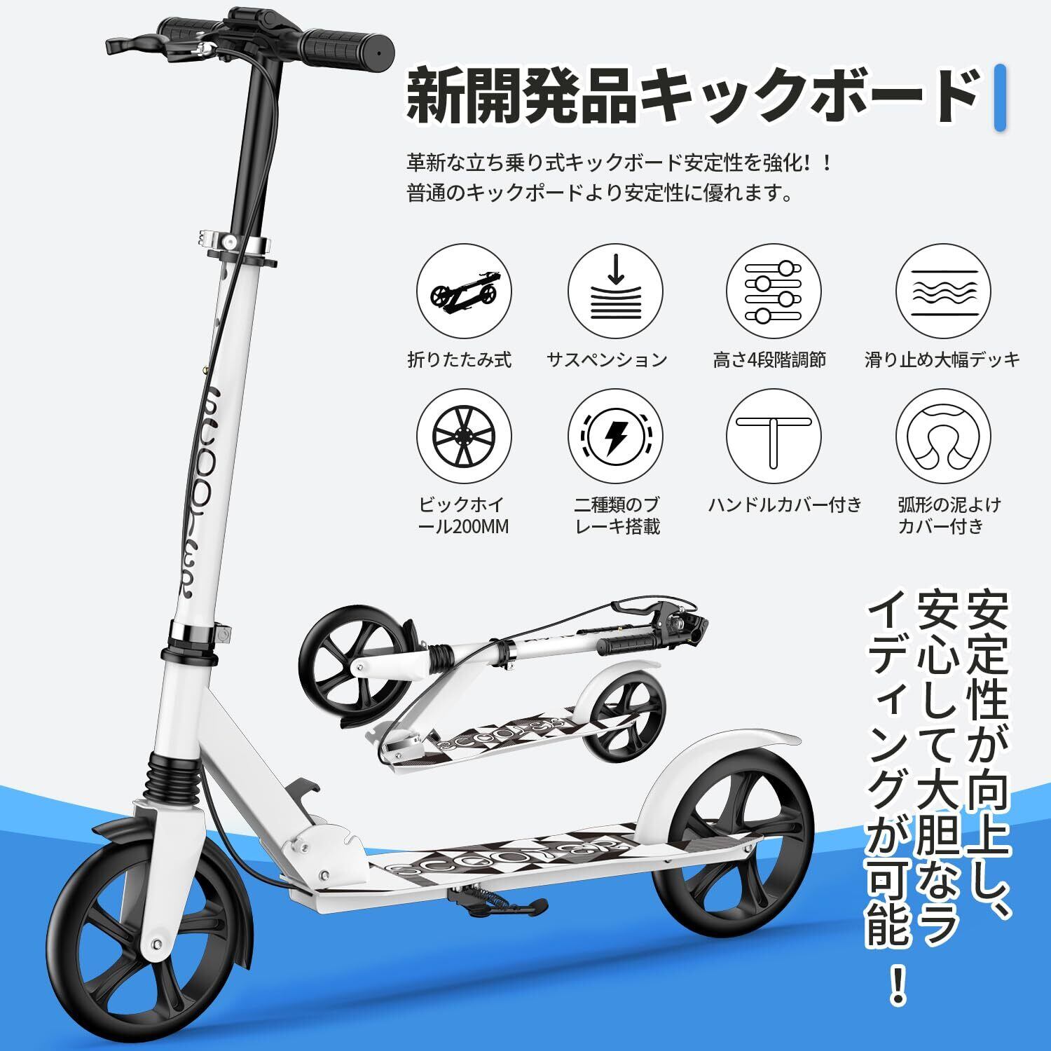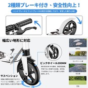 【新開発キックボード】このキックボードは幅が広く滑りにくい板面と低床設計ペダルの最新バージョンで、安全で快適な滑りをサポートすることができて、安定性を大幅に強化し、初心者でもバランスをよく把握することができます。ラバーグリップはグリップ性が強いを持ち、持ち手にはバックル設計を採用しているため、グリップの隙間が小さくなり、揺れにくく、安全です。フロントブレーキとリアブレーキにより高い制動性能を実現しています。急ブレーキにはよく反応します。軽く力を入れてもしっかりブレーキを踏めるので、安全で安心です。雨の日や下り坂でも十分な制動力を発揮します。自分やプレゼントにぴったりです。