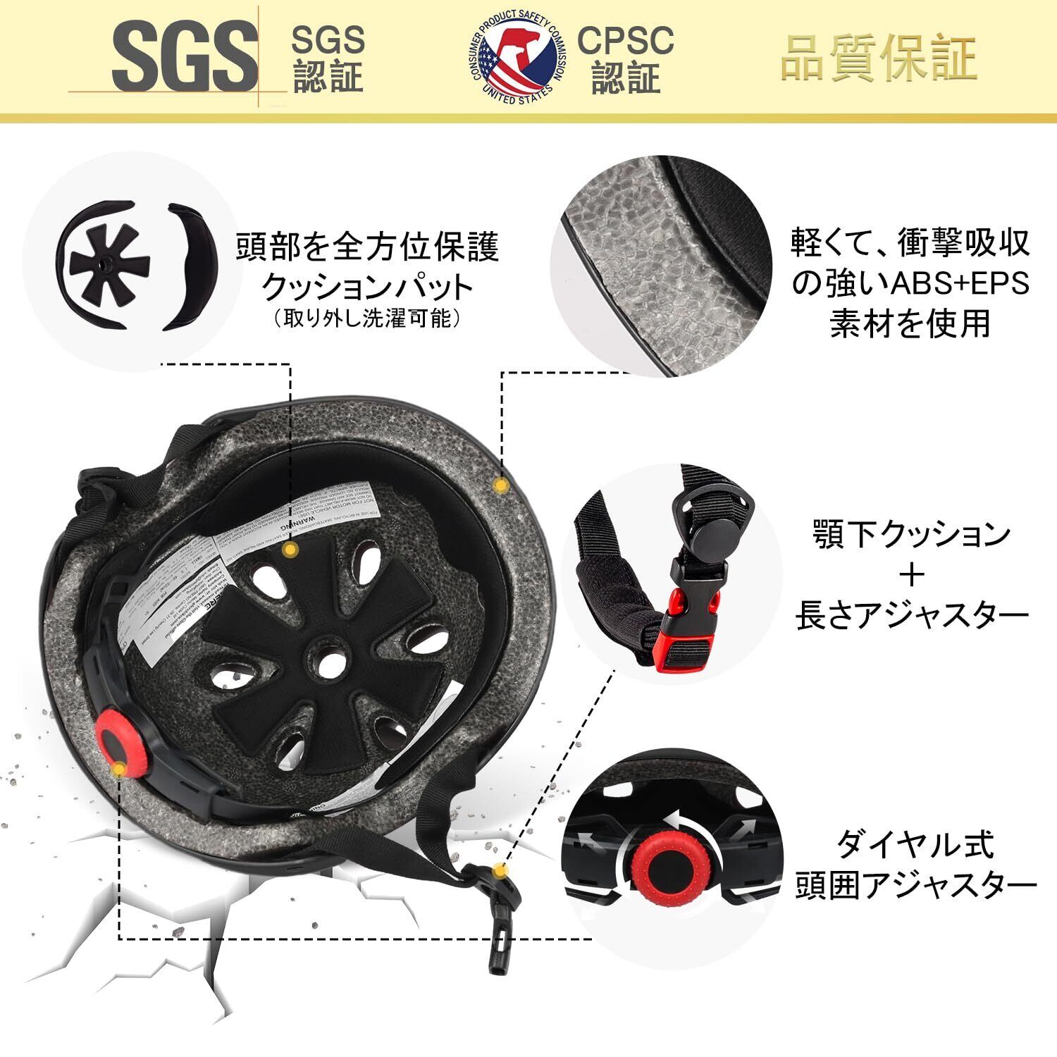 【耐衝撃性材料を使用】外部は軽さと頑丈さ両持ちのABS素材、内部ば衝撃吸収性が優れる高密度EPS素材を使用し、大切な頭部をちゃんと守っている。【CPSC規格 SGS認証取得】信頼できるアメリカ合衆国消費者製品安全委員会が定める安全基準のCPSC(1203)認証を取り、また世界トップレベルの認証SGSテストを合格済み。