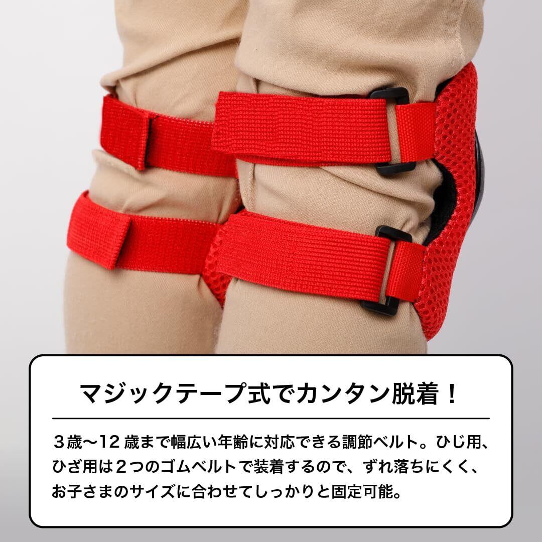 【マジックテープ式で脱着も簡単 】ひじ用、ひざ用は2つのゴムベルトでずれ落ちにくく、しっかり固定可能。手のひら用は親指を通して装着するためずれる心配がなく、ベルト固定で装着も簡単です。3歳~12歳まで幅広い年齢に対応できる調節ベルト。