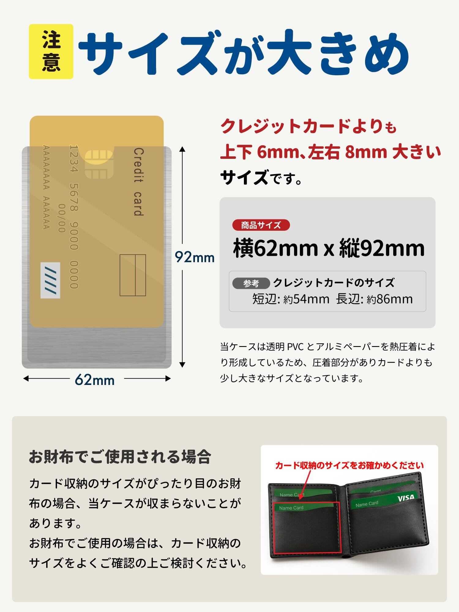 【ご購入前にサイズを要チェック】当品の外寸サイズは約6.2 × 9.2cmと一般カードより数mm大きめです。財布のカード収納スペースよりも大きく、収まらない可能性があります。財布でご使用される場合はサイズをよくご確認ください。