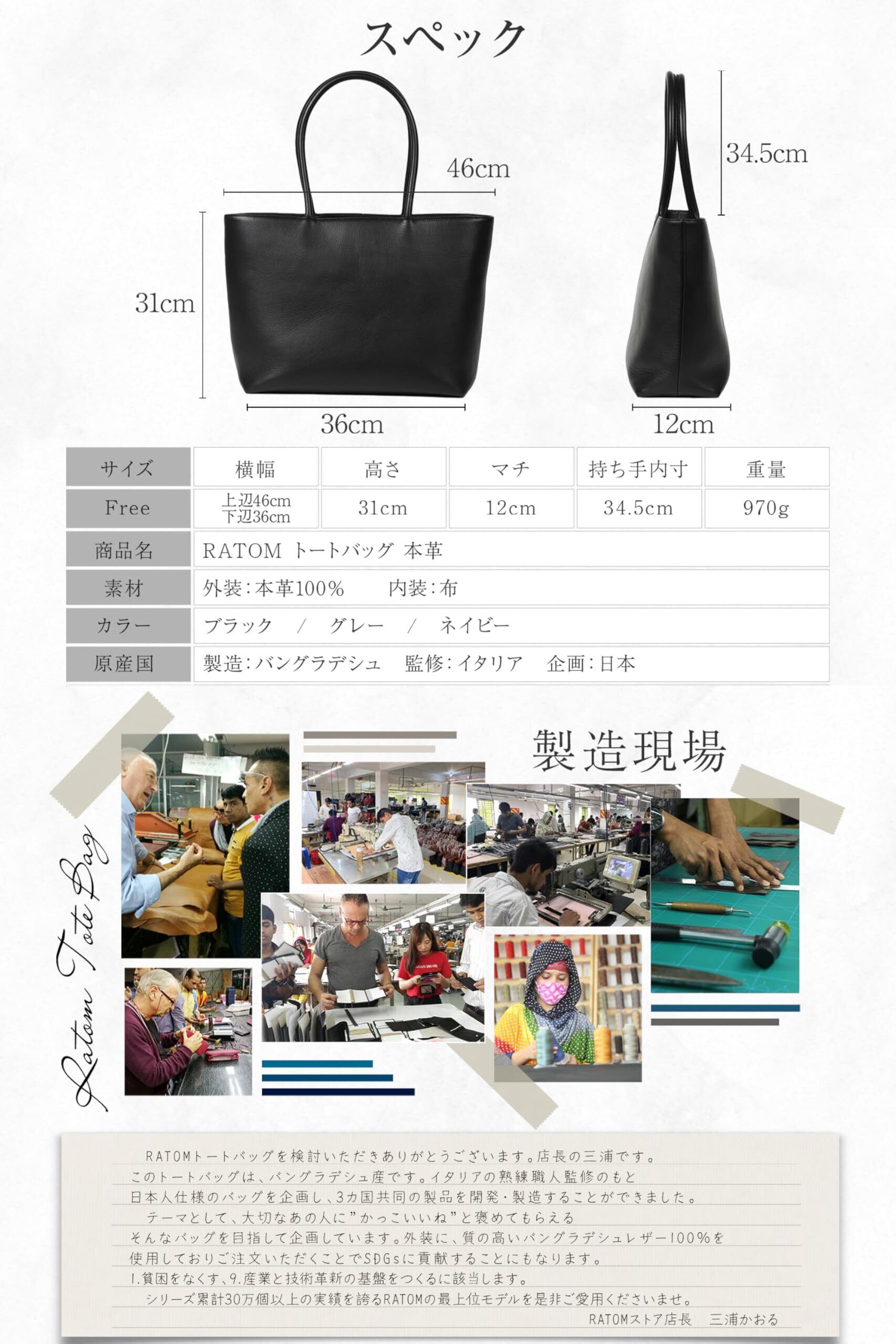 【本革】バングラデシュ産の天然皮革(牛革)100%のトートバッグです。光沢が少ない本革でシュリンク(上品で均一な美しさを保つ凸凹)加工を施していますので、綺麗なシボ感となっています。シュリンクレザーは、本革製品の中でも傷がつきにくいです。本革製品は水濡れ厳禁ですが、RATOM製品は雨でもシミにくいため急な雨でも少し耐えることができます。基本的には水濡れ厳禁のため、必ずご帰宅後には乾拭きなどのケアしてください。
