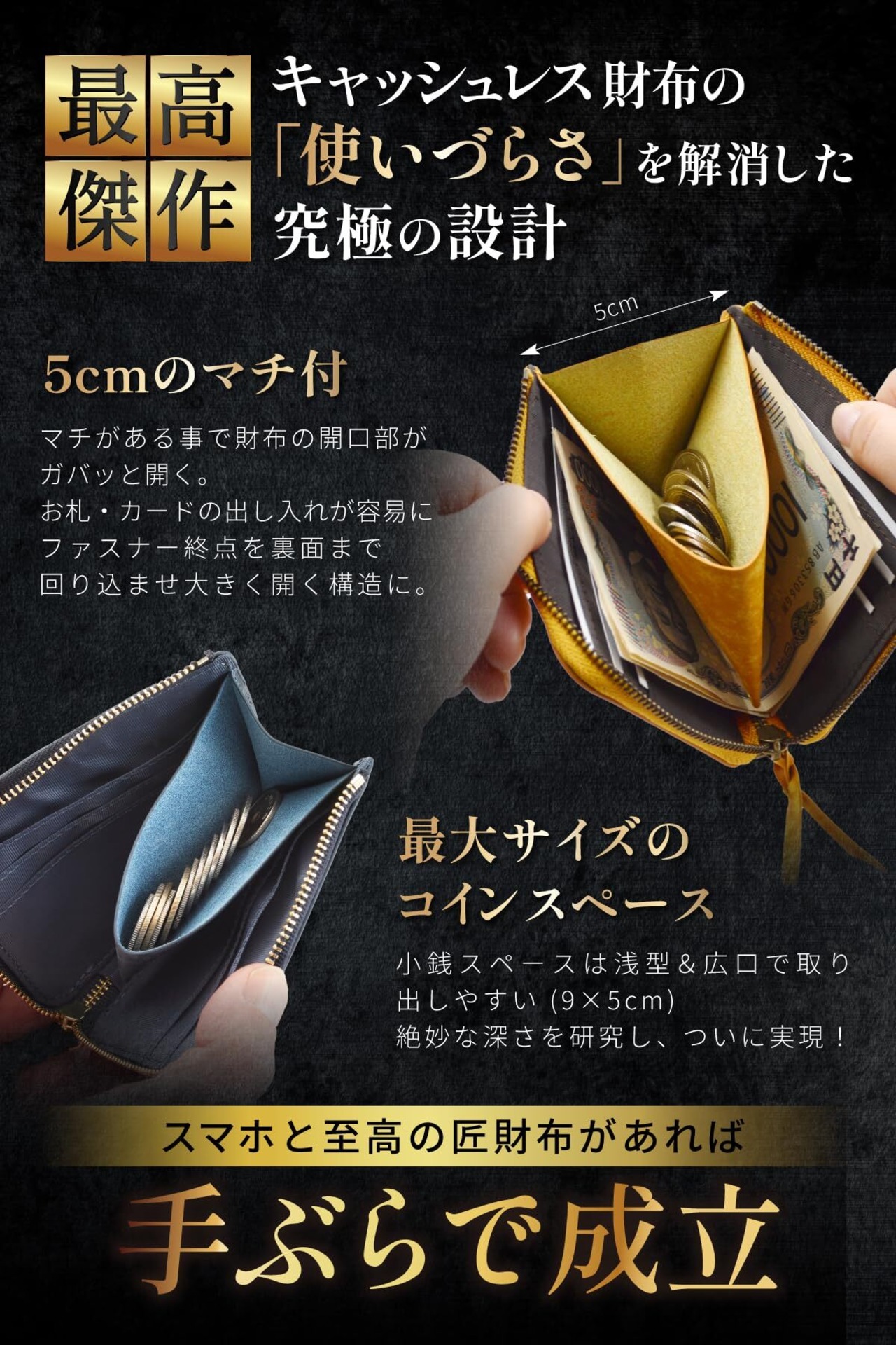 【L字ファスナー財布の使いづらいを解消】①コインスペースが深く狭く取り出しずらい、②財布開口部狭くカード・お札出し入れしづらい、③お札がファスナーで傷ついてしまう、④カードを重ねて入れるため破損する事がある、⑤安価なファスナーは壊れやすい・・・これらを解決します。