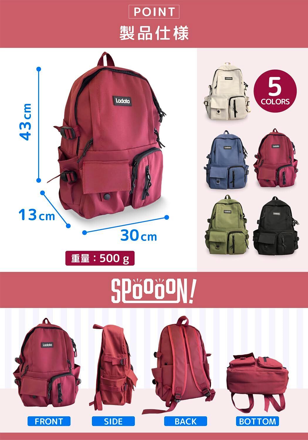 【大容量&多いポケット】サイズ:横30x 奥行13 x 高さ43cm、0.50kg。学校に持ち運ぶ教科書やPCなどの貴重品をすっぽりと簡単に収納できるメインスペースをはじめ、折りたたみ傘やペットボトルの収納に便利なサイドポケットやすぐに取り出したい小物を入れておけるフロントポケット。