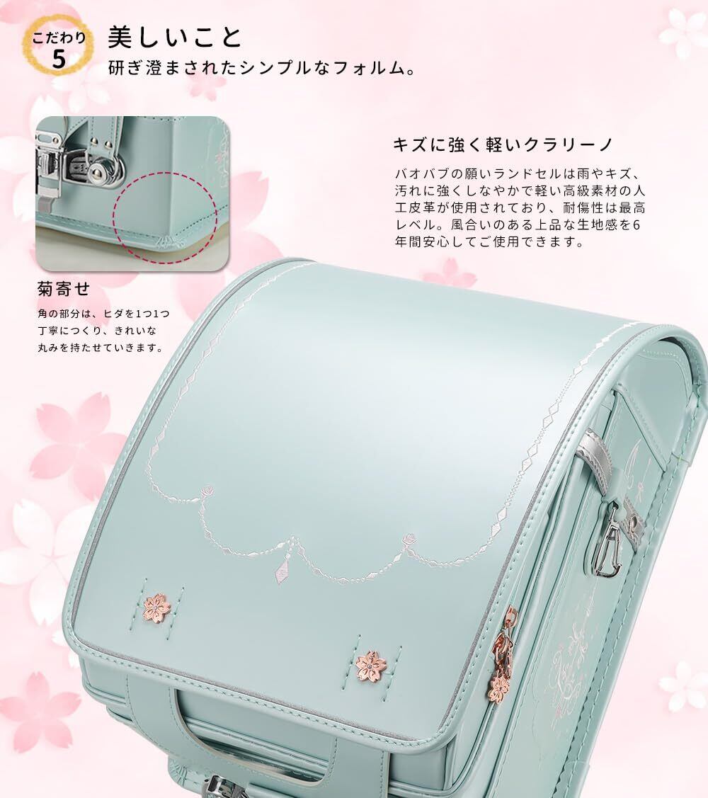 [バオバブの願い] 2025年 ランドセル 女の子 ワンタッチロック 軽量 豪華 刺繡 A4フラットファイル対応 japanese schoolbag エレガント Bab-Rns023 (華・若緑)