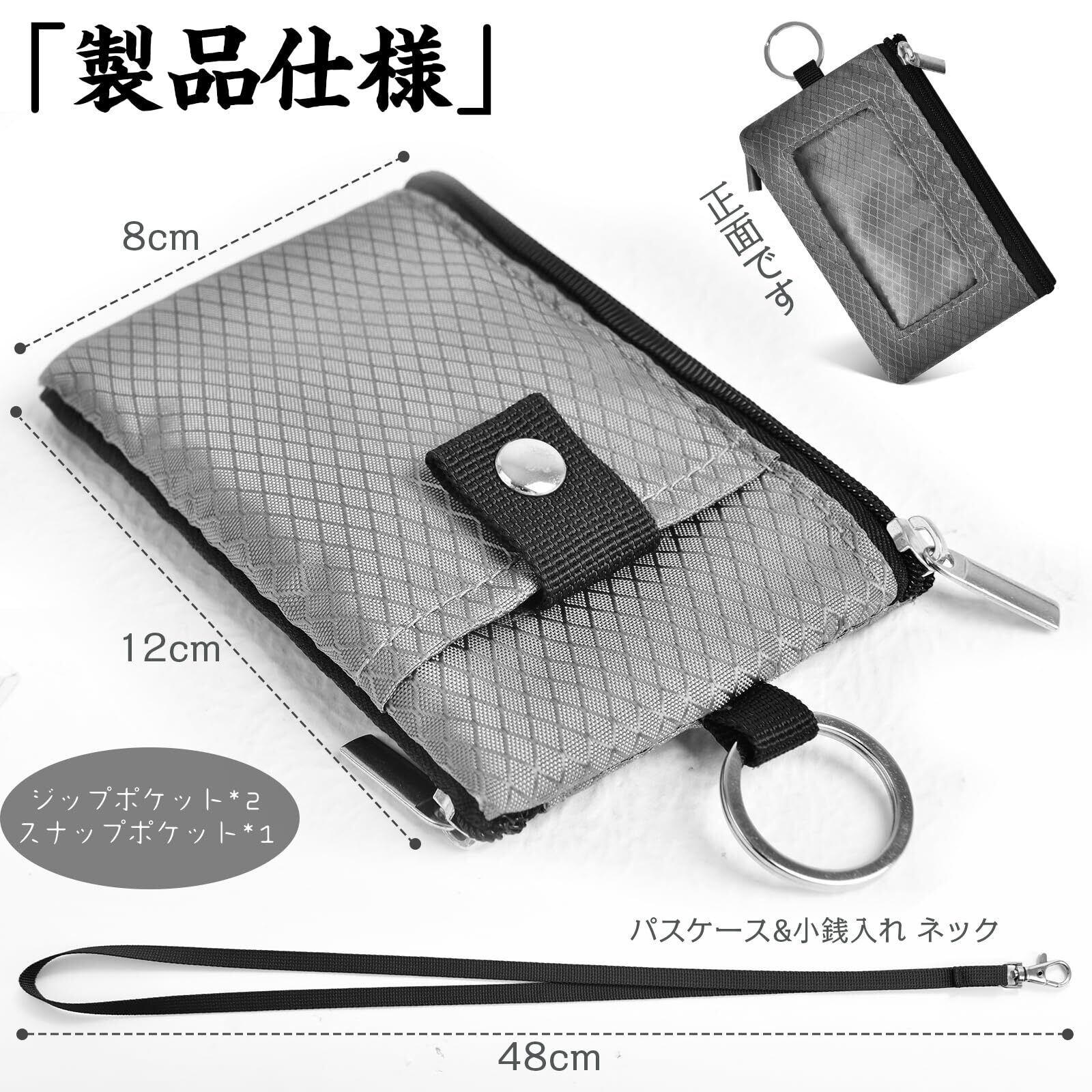 【製品仕様】パスケース 小銭入れ付きのサイズ (約)縦12cm×横7.8cm、重さ40g。取り外し可能なネックストラップ付き、長さは約48.5cm、手動測定のため、1~3cmの誤差があります。キーホルダー付きカードホルダー、前面にジッパー付き透明ポケットが1つ、ジッパー付きポケットが2つあり、紙幣やレシートなどの小物を収納できます。ファスナー付きメインポケット1つ+背面にスナップボタン付きカードポケット1つ。ポリエステル防水素材。
