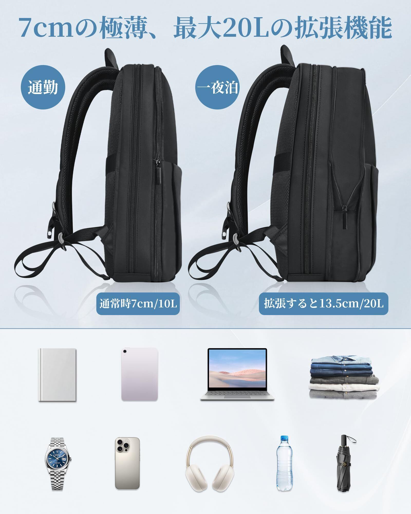 【極薄で20Lまで拡張】ビジネスリュックはわずか7cmのスリムさと800gの軽さで、満員電車でも快適に持ち運べる設計。ファスナーを開けば容量は10Lから20Lに早変わり。普段使いの通勤用 リュックとしてはもちろん、2日1泊の出張にもぴったり。20Lの容量で機内持ち込み可能です。