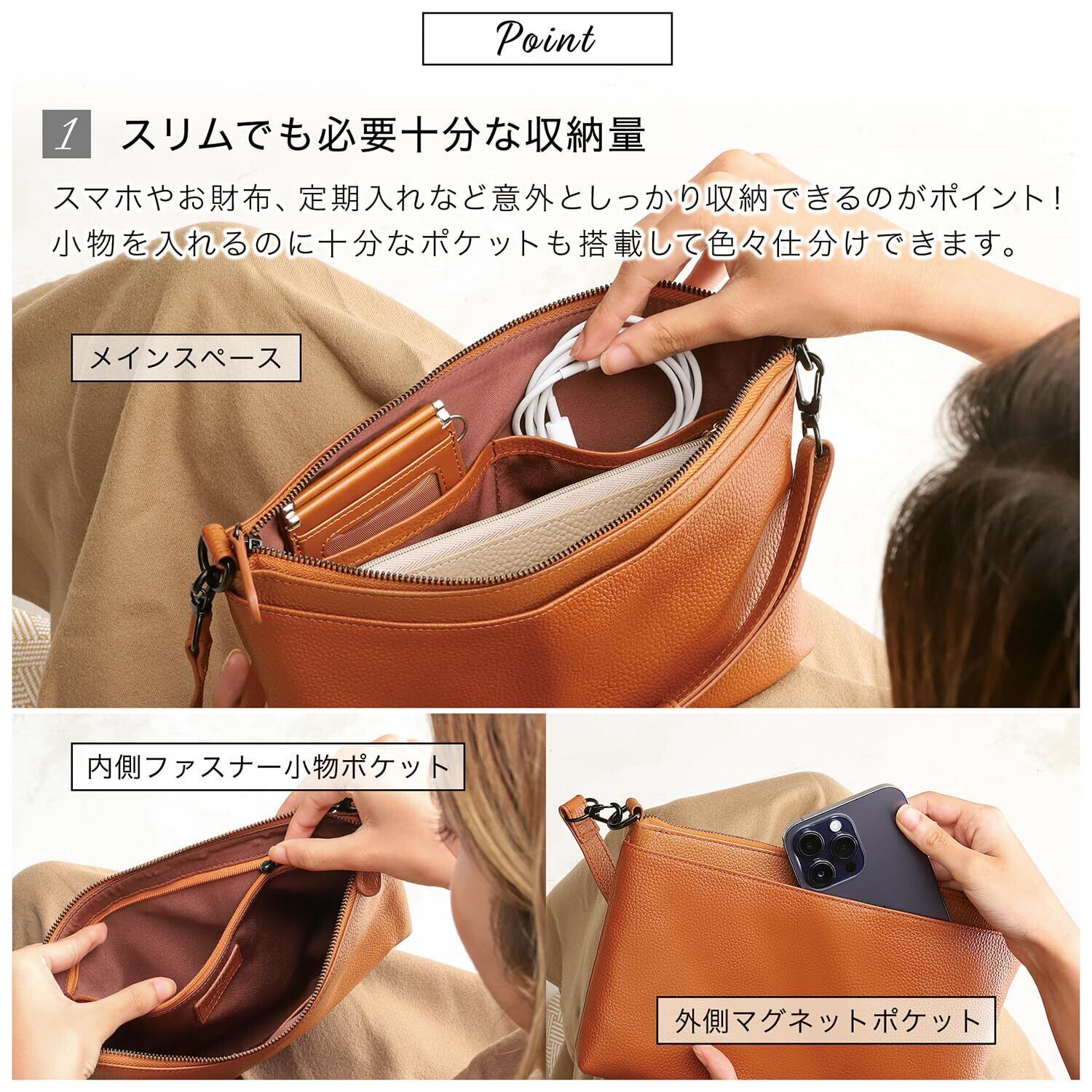 ■【実用的な収納スペース】メインコンパートメントには、スマートフォンや財布、パスケースなどをスムーズに収納可能なスペースを確保。外ポケットも設計されており、すぐに取り出したいアイテムを整理整頓できます!