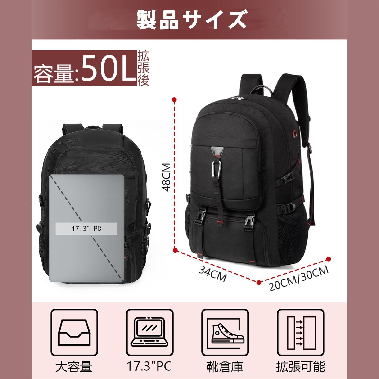 ■【拡張可能な収納力】このバックパックは、40-50Lの大容量を誇ります。メインコンパートメントは、衣類や装備をすっきりと収納できる設計。もちろん、靴収納スペースも備えており、アウトドアシーンでの使用時にも安心です。