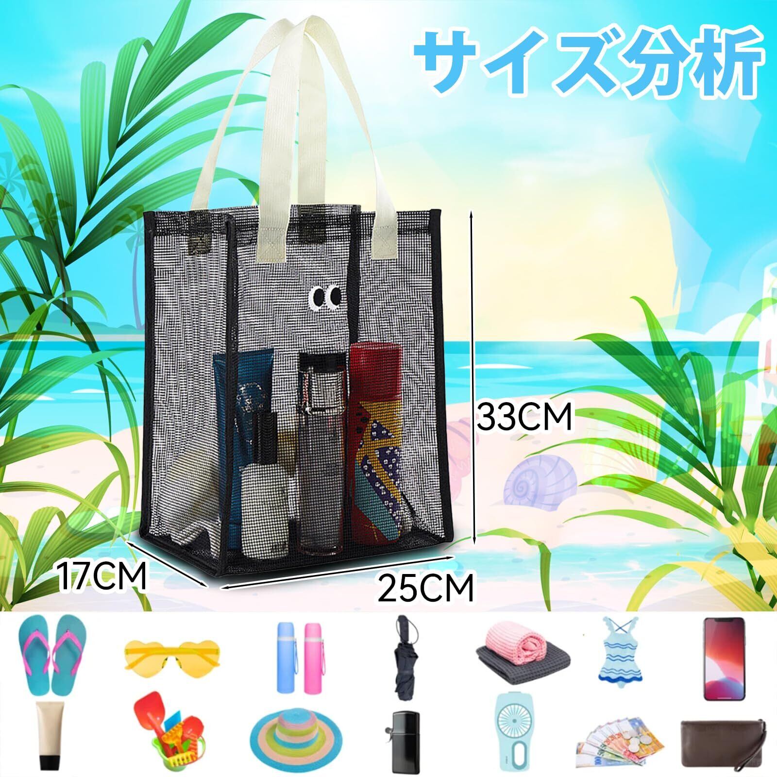 【大容量ビーチバッグ】衣服、靴、おもちゃ、化粧品、おやつ、タオルなどをすべて収納できる大容量のバッグです!水筒やスリッパ、眼鏡や傘などは表面のポケットに収めて便利に使えます。海やプール施設へ行ったり旅行する際に最適です。