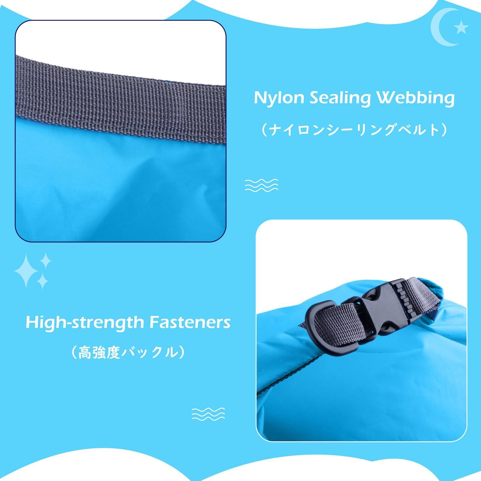 【使い方】①開口部を揃えて下さい。②開口部を折りたたんで下さい。③3~4回折り曲げて下さい。④バックルでワンタッチロックするだけで簡単にお使い頂けます。️ご注意 -- ビーチバッグは防水性に非常に優れておりますが、100%の防水性はできかねますので、潜水状態で使用しないでください!