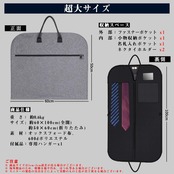 【デザイン】①疲れにくい強化ナイロンハンドルを採用。布を重ねて縫うことによりハンドル周りが補強。 ②両サイドにも開閉ファスナー。 ③スーツが取り出しやすい前開きタイプ。 ④名札を入れられるポケット付き。 ⑤ネクタイを2本分収納可能。 ⑥フロント部分は、小物などを収納できるポケット付き。