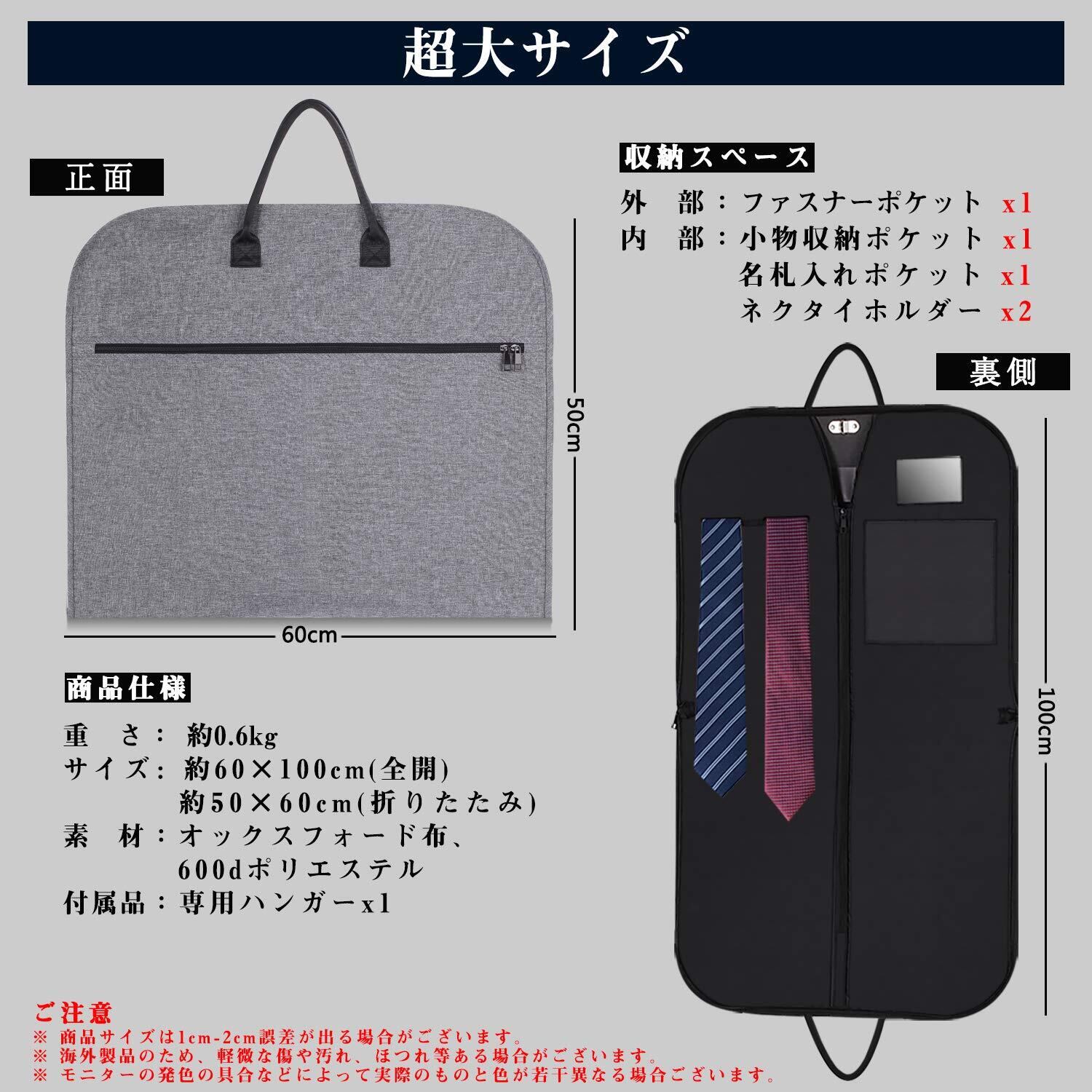 【商品詳細】全開サイズ:約100cm*60cm 折りたたみサイズ:約50*60cm 重さ:約0.6kg 素材:オックスフォード布、ポリエステル、 ※ お客様のレビューをご覧になって持ち手の部分が既に改良しました。合成皮ではなく、耐久性の高い素材で丁寧に縫い、切れにくくなります。また従来タイプのガーメントバックに比べて大きく使いやすいワイドサイズなので、がっちり体形の方のスーツもしっかり収納できます。