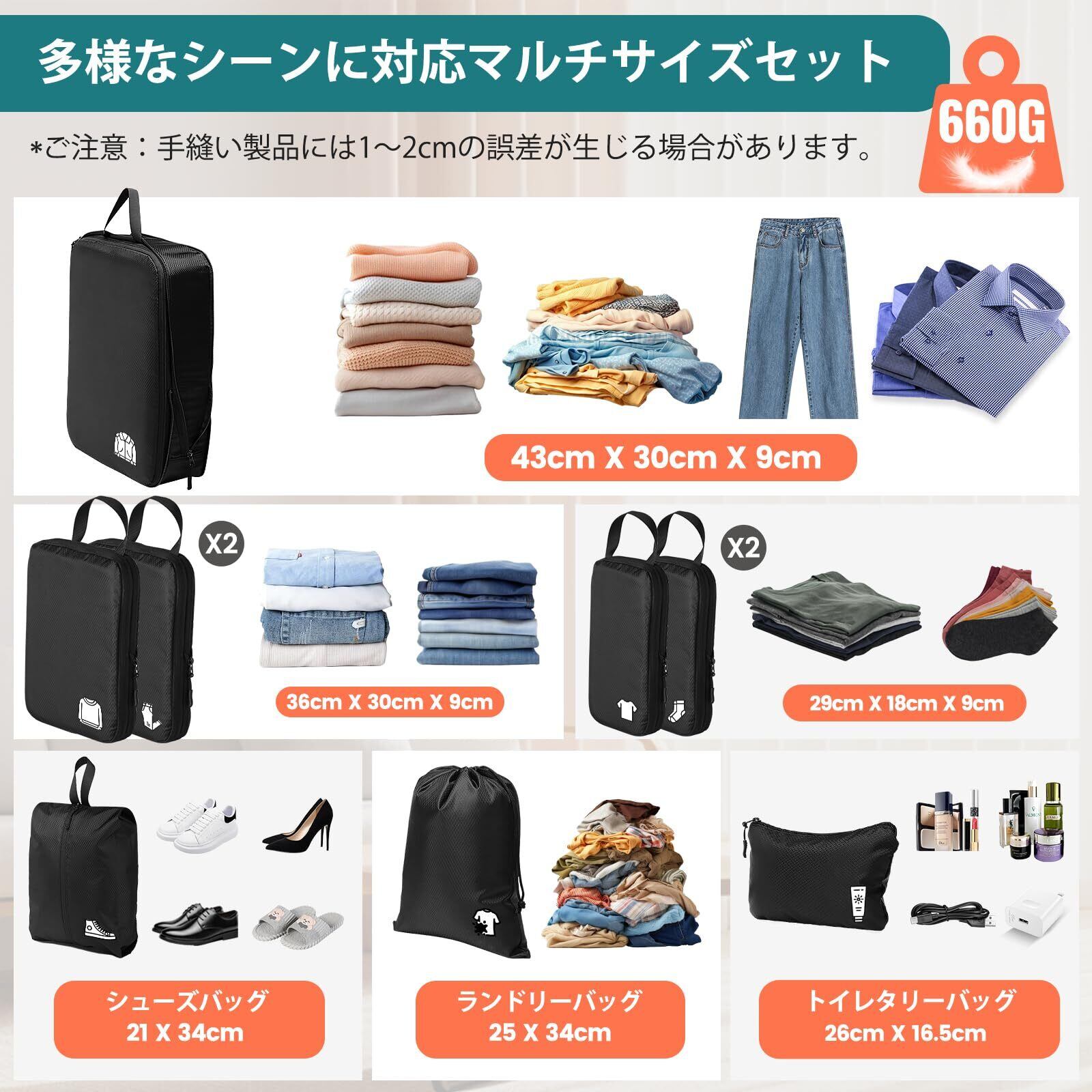 【8点セットでスマート収納】XLサイズ(43×30×9cm)、Lサイズ(36×30×9cm)*2、Sサイズ(29×18×9cm)*2の衣類収納ポーチに加え、シューズバッグ(21×34cm)、トイレタリーバッグ(26×16.5cm)と巾着袋(25×34cm)の充実セット。清潔な衣類と汚れた洗濯物を分けて収納できるから、スーツケース内が衛生的に整理でき、旅行中のストレス軽減に大活躍!
