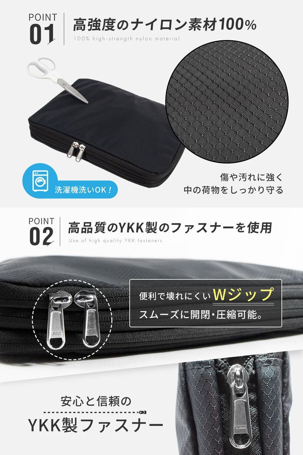 【こだわりの品質】開閉部分には、耐久性と滑らかさに定評のある日本製「YKKファスナー」を採用。壊れにくいWファスナーで、しっかり圧縮&スムーズな出し入れが可能。高強度ナイロン素材を100%使用しているため、汚れにも強く、洗濯機で丸洗いもOK(※洗濯ネット使用推奨)。
