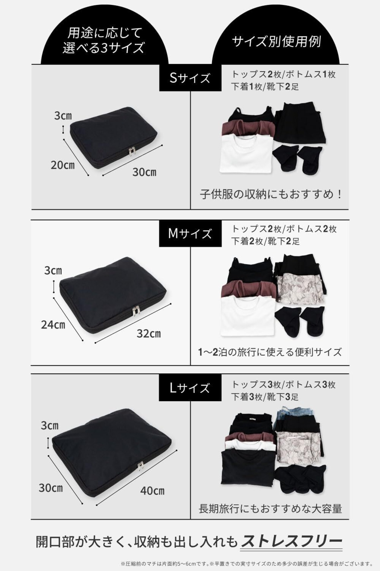 【ファスナーを閉めるだけで簡単圧縮!】 かさばる衣類も、ファスナーを閉じるだけでスッキリ圧縮。容量や用途に合わせて選べる3サイズ展開で、スーツケースの整理整頓がラクに。出張や旅行はもちろん、バッグインバッグやおむつポーチ、子供服の仕分けにも活躍します。