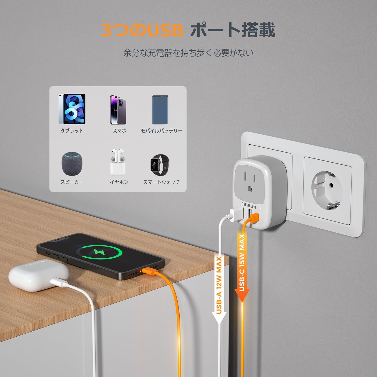 【人気商品】韓国 変換プラグ seタイプ TESSAN 海外 変換プラグ se コンセント 1個AC口 2USB-Aと1USB-Cポート 韓国 ドイツ フランス オランダ ハンガリー スペイン ヨーロッパなどへ海外旅行用便利グッズ | SmartLiving+