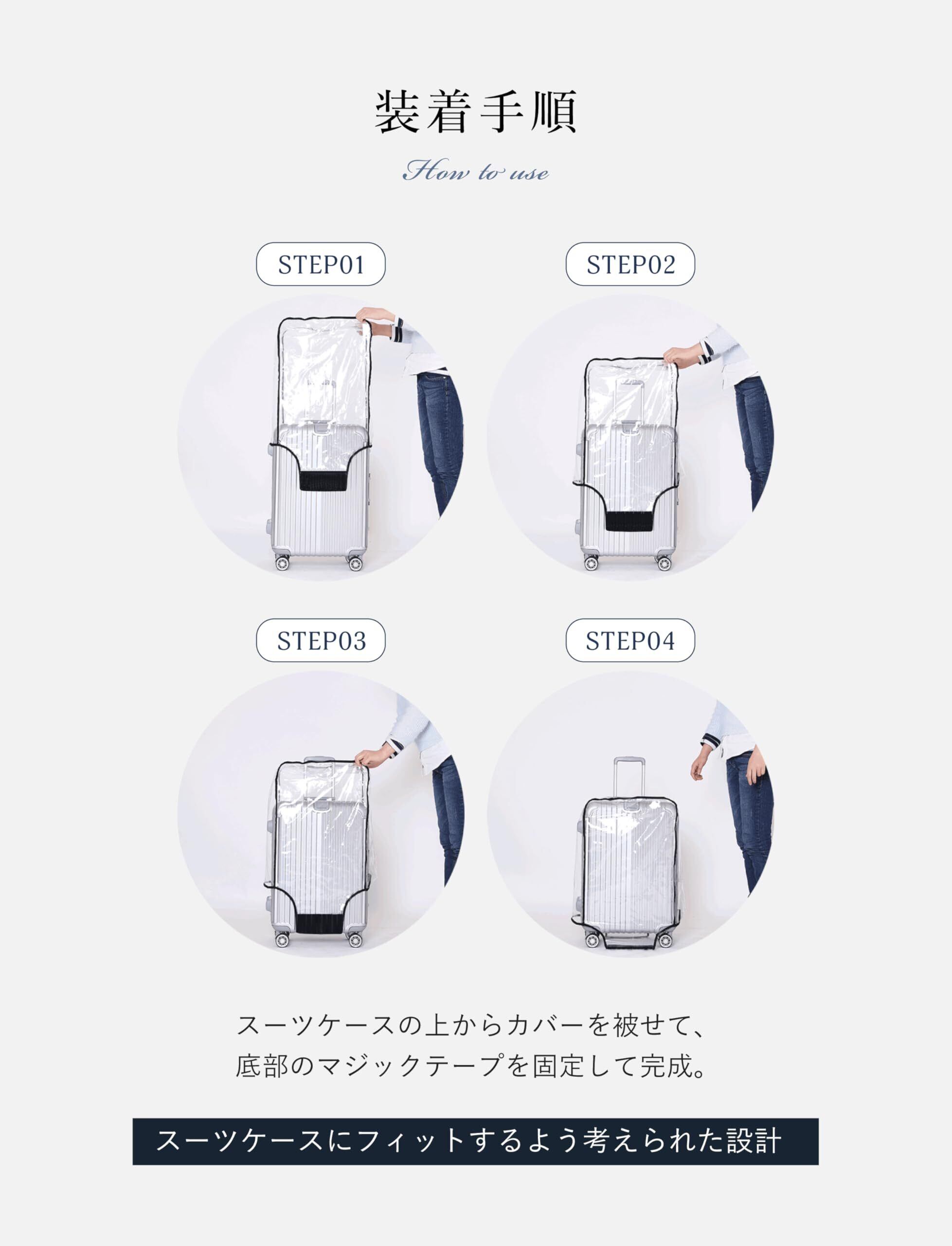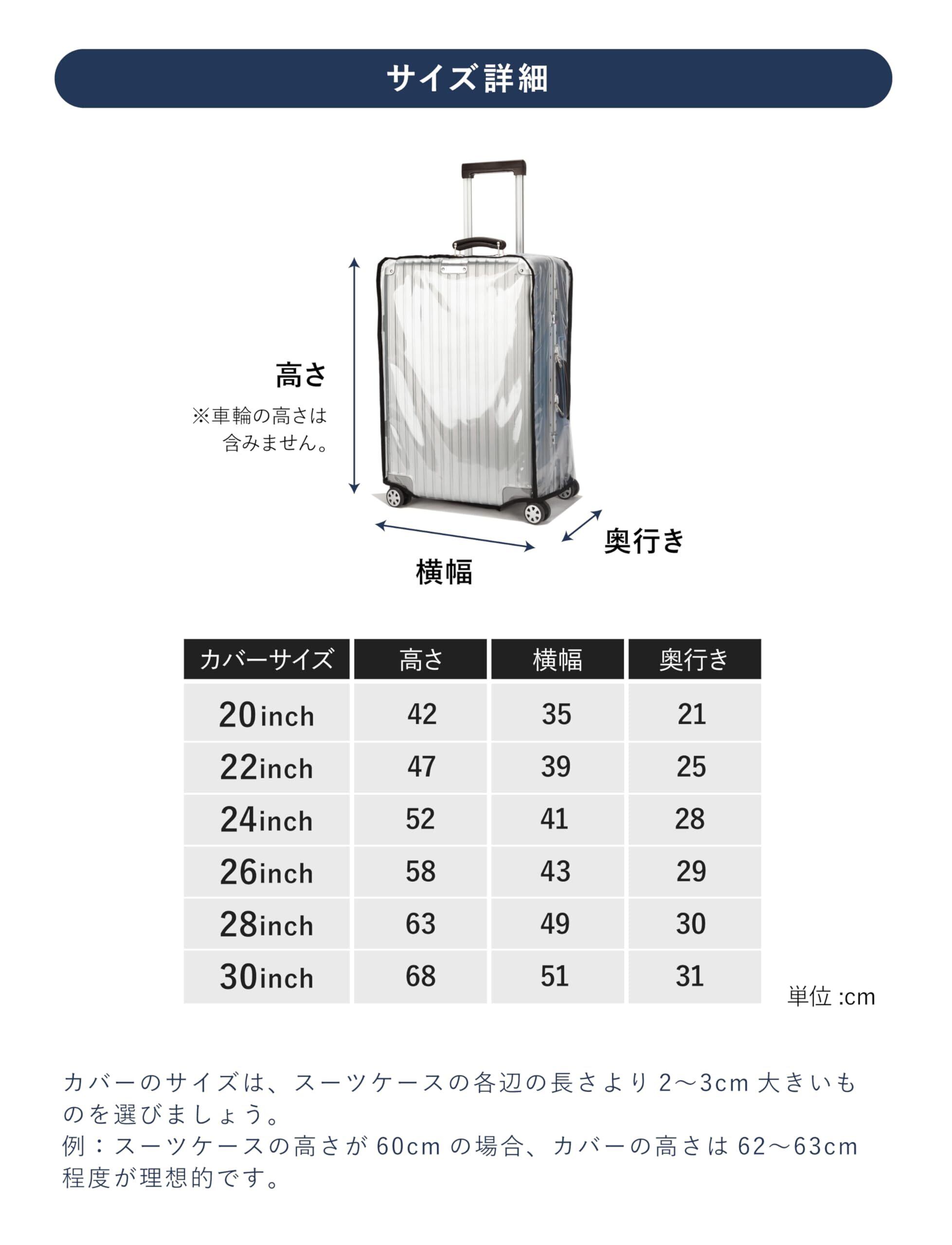 【特徴】:【防水効果で雨の侵入を防ぐ】【傷、汚れから保護】【透明なのでスーツケース本来のデザインを生かす】【軽量・コンパクト収納】【豊富なサイズバリエーション】※登録済【登録第5905675号】