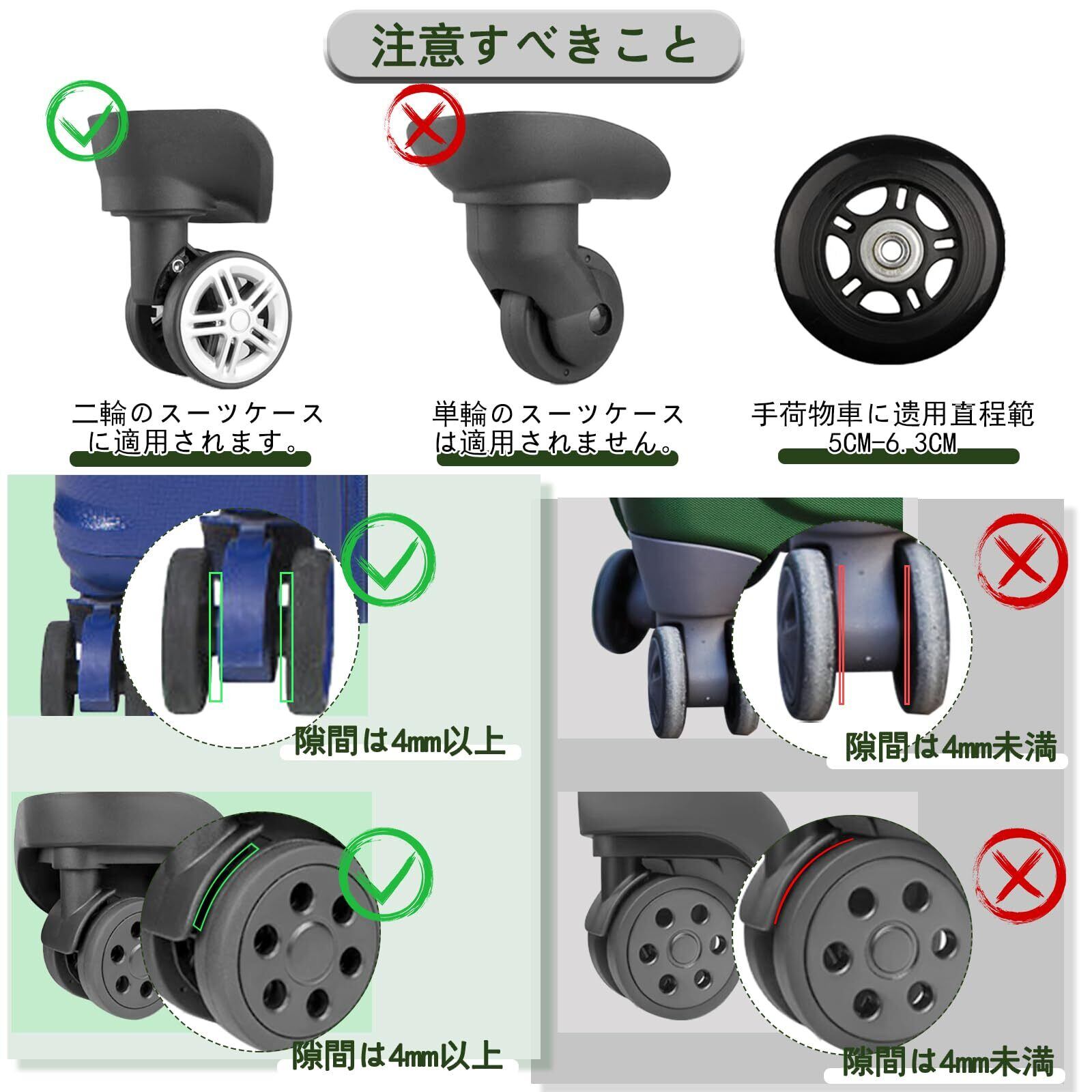 16 個セット&ユニークな模様デザイン:当社のスーツケースの車輪保護セットは 8 個のキャスターカバーと 8 個の予備カバー(合計 16 個の車輪保護カバー)を含み、2 つのスーツケースの車輪にも十分に使用でき、予備の保護カバーは摩耗した際に随時交換できます。スーツケースの車輪カバーは非対称模様を採用し、オフロード型のデザインスタイルで、車輪が回転する際の摩擦力を効果的に増やし、ノイズを抑制します。外径は約5.4cm、高さは約1.4cmで、5cm - 6.3cmの車輪に適合します。購入前には、車輪とフェンダーの間の距離が少なくとも4mm、車輪とキャスターブラケットの間の距離が少なくとも4mmであることを確認してください。